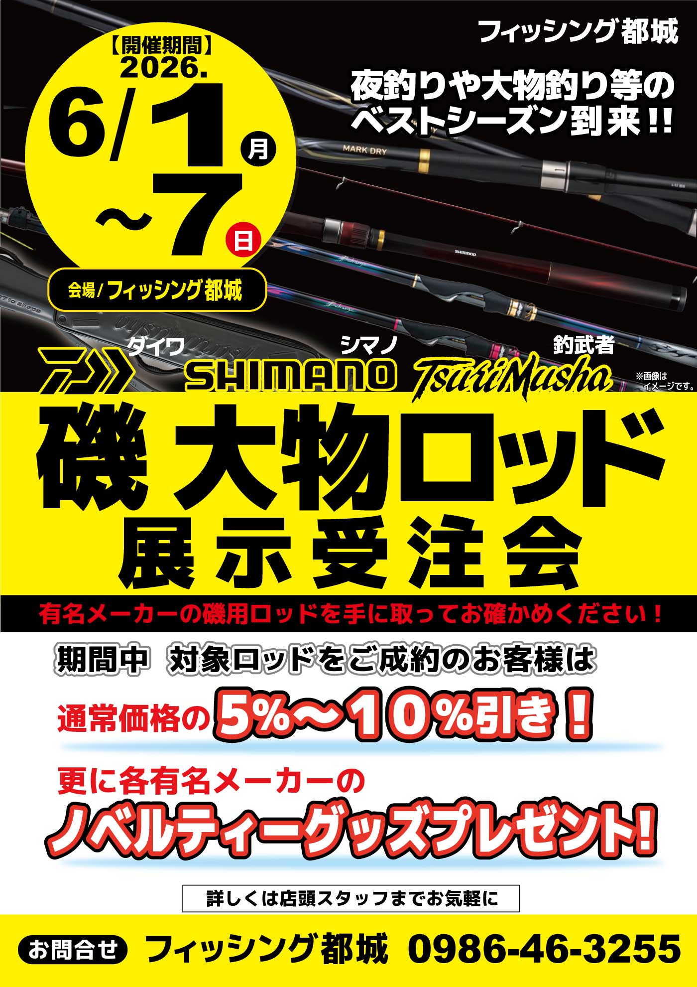 6月012026 【フィッシング都城】ダイワ/シマノ/釣武者 磯大物ロッド展示受注会 イベント 開催期間 6月1日(月曜日)〜6月7日(日曜日) 開催場所 フィッシング都城 参加費 問い合わせ フィッシング都城店 TEL.0986-46-3255