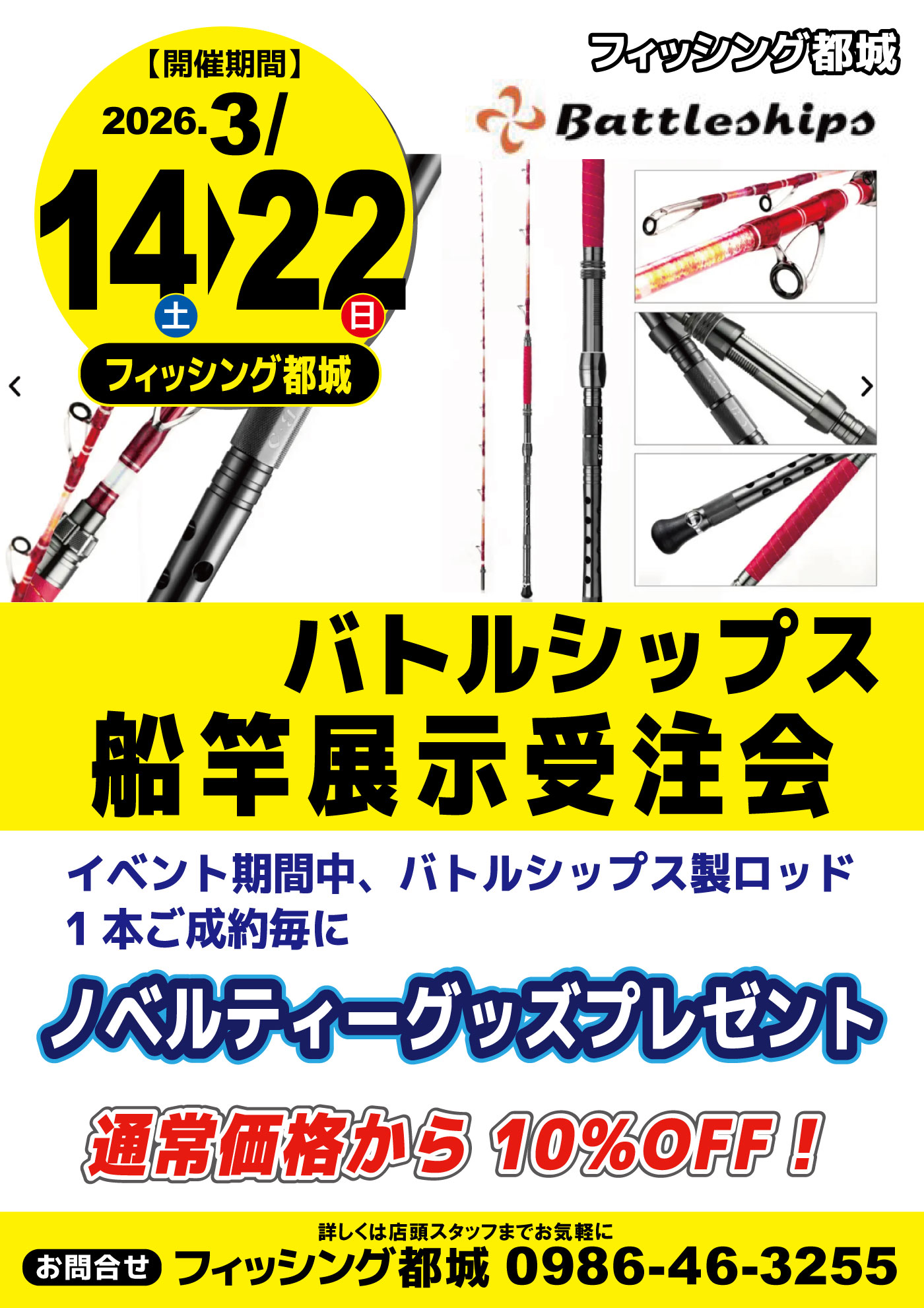 3月222026 【フィッシング都城】バトルシップス船竿展示受注会 イベント 開催期間 3月14日(土曜日)〜3月22日(日曜日) 開催場所 フィッシング都城 参加費 問い合わせ フィッシング都城店 TEL.0986-46-3255
