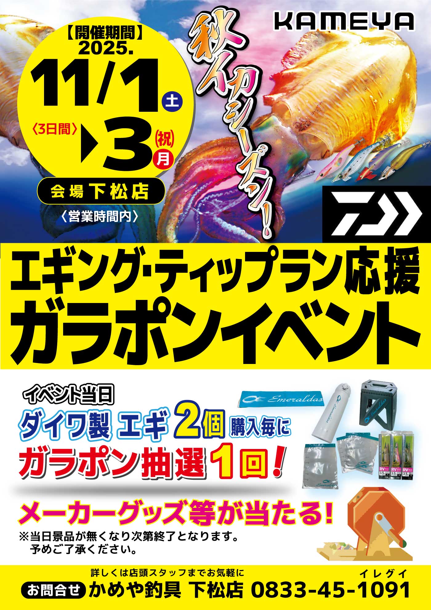 11月012025 【下松店】エギング・ティップラン応援ガラポンイベント イベント 開催期間 11月1日(土曜日)〜11月3日(月曜日) 開催場所 下松店 参加費 問い合わせ 下松店 TEL.0833-45-1091