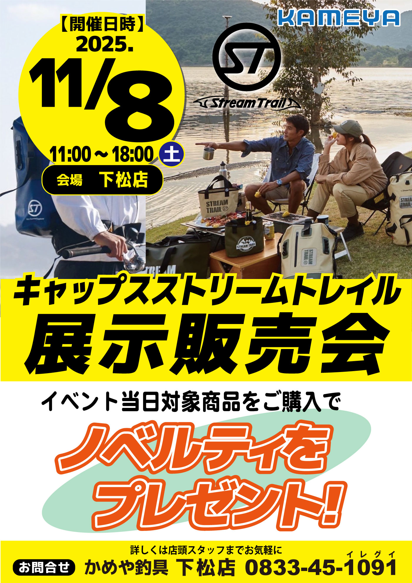11月082025 【下松店】キャップスストリームトレイル展示販売会 下松店 開催期間 11月8日(土曜日)11:00~18:00 開催場所 下松店 参加費 - 問い合わせ 下松店 TEL.0833-45-1091