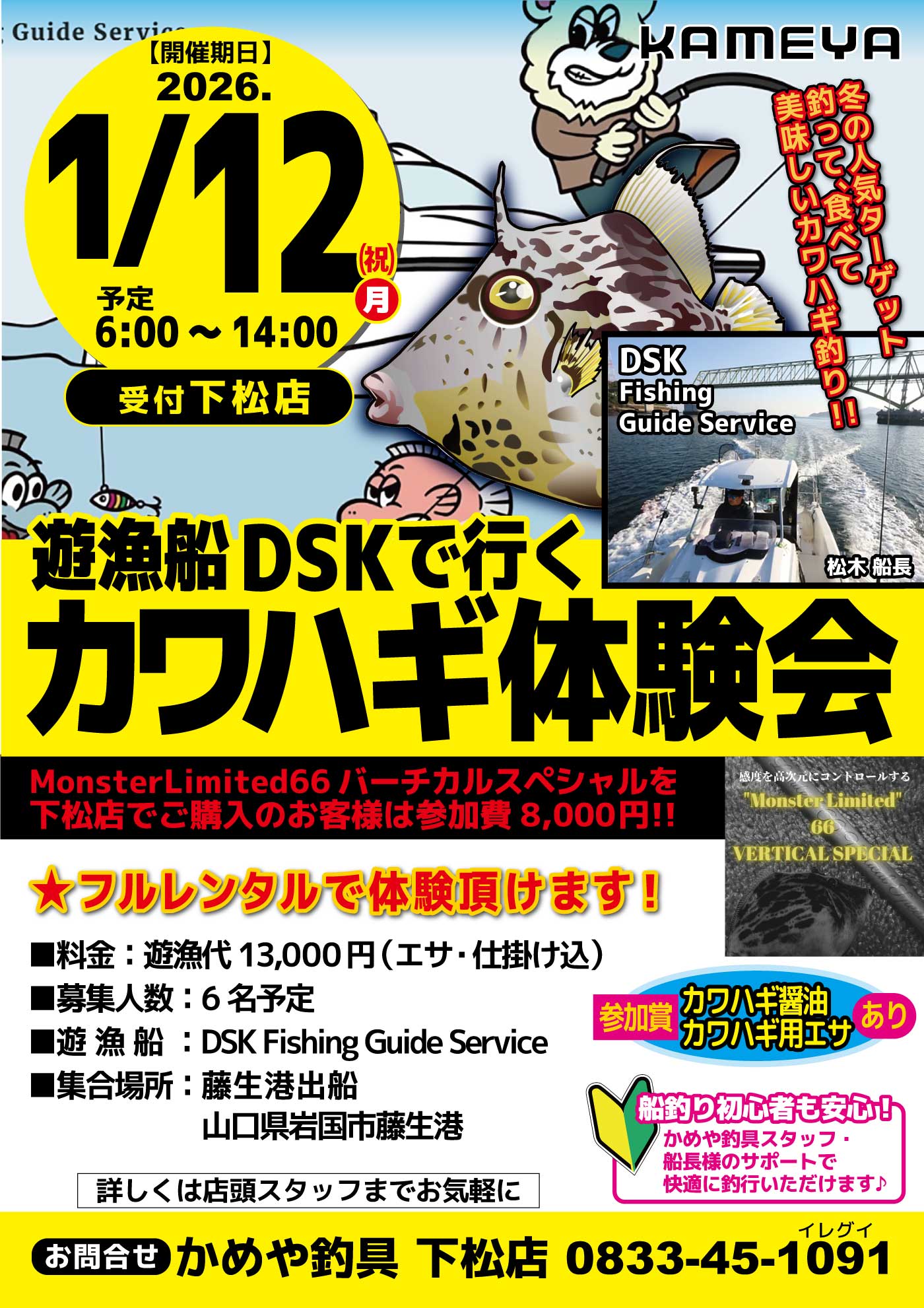 1月122026 【下松店】遊漁船DSKで行くカワハギ体験会 イベント 開催期間 1月12日(月曜日)〜1月12日(月曜日) 開催場所 山口県岩国沖 参加費 13,000円 問い合わせ 下松店 TEL.0833-45-1091