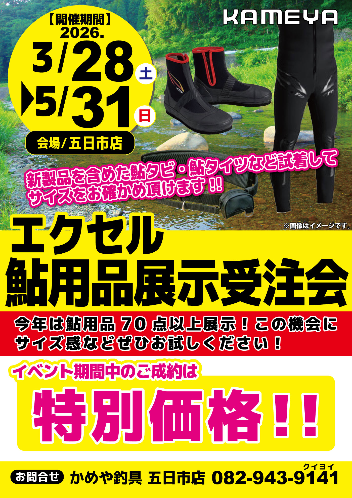 5月312026 【五日市店】エクセル鮎用品展示受注会 イベント 開催期間 3月28日(土曜日)〜5月31日(日曜日) 開催場所 五日市店 参加費 問い合わせ 五日市店 TEL.082-943-9141