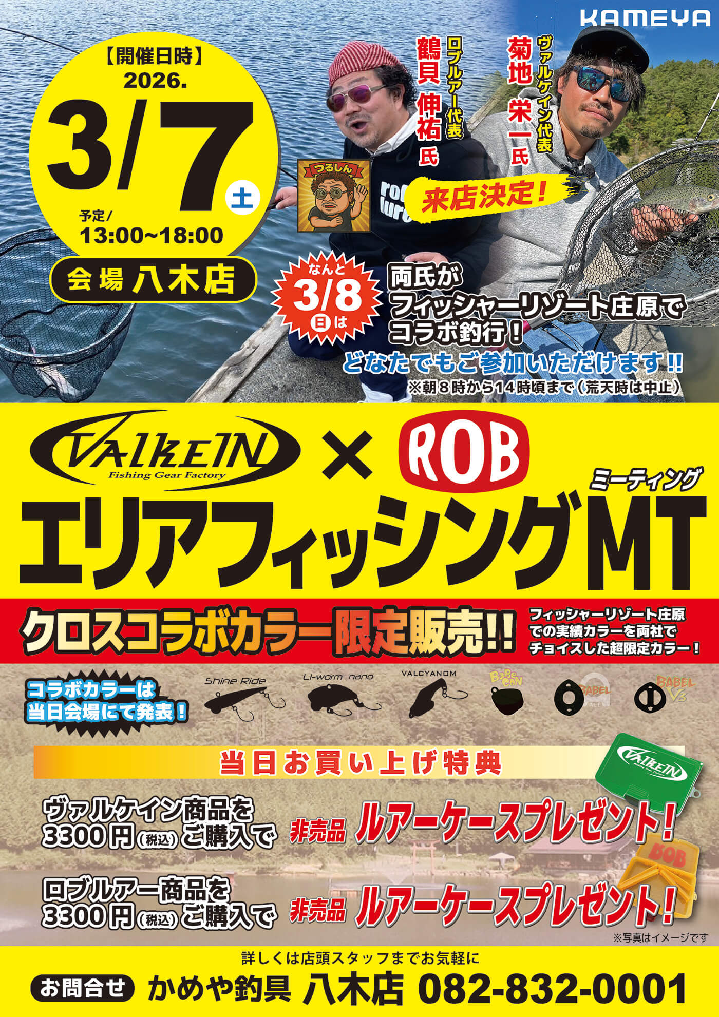 3月072026 【八木店】ヴァルケイン X ロブルアー エリアフィッシングMT イベント 開催期間 3月7日(土曜日)13:00~18:00 開催場所 参加費 問い合わせ 八木店 TEL.082-832-0001