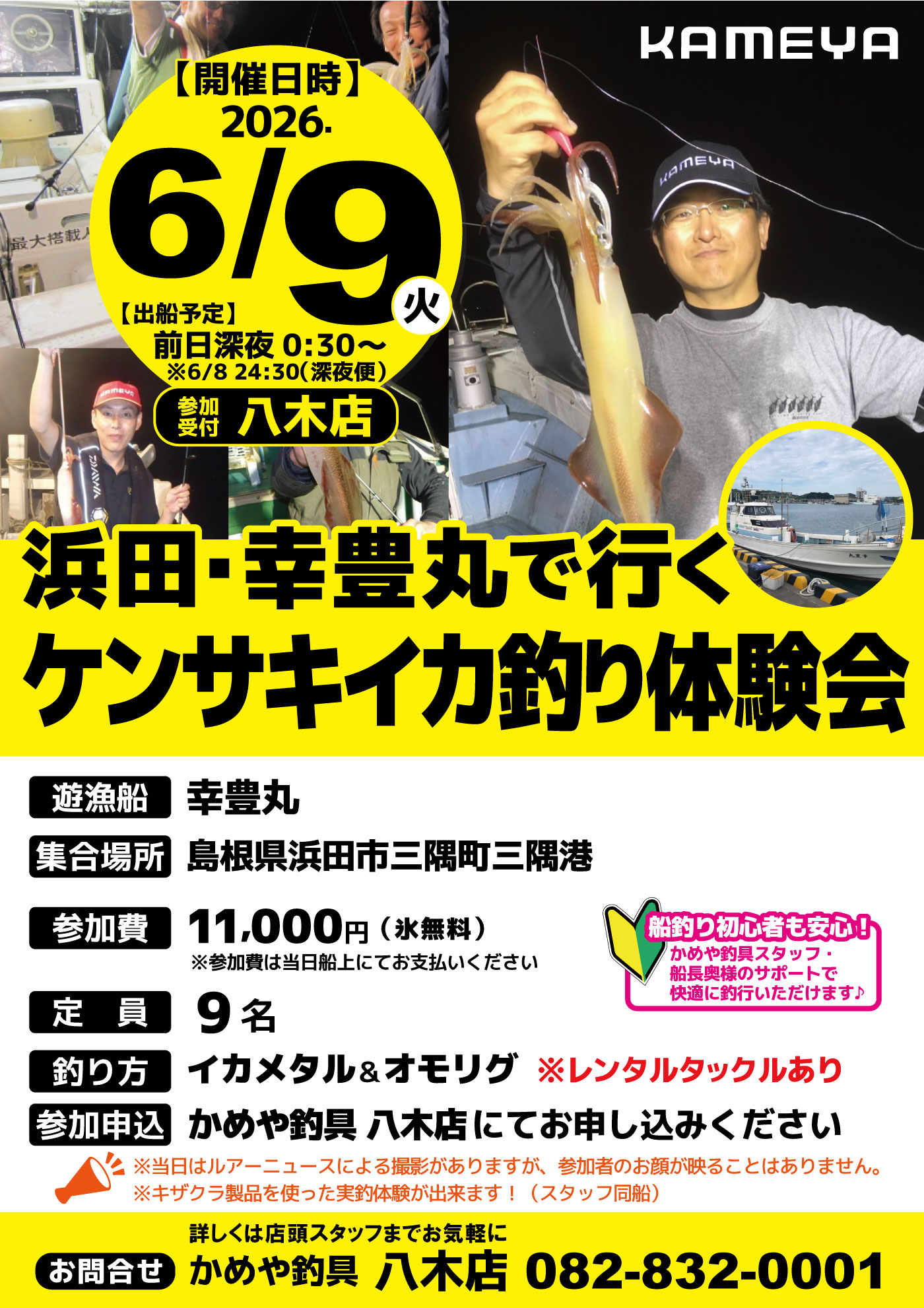 6月092026 【八木店】浜田・幸豊丸で行く!ケンサキイカ釣り体験会 イベント 開催期間 6月9日(火曜日)0:30~ 開催場所 八木店 参加費 11,000円 問い合わせ 八木店 TEL.082-832-0001