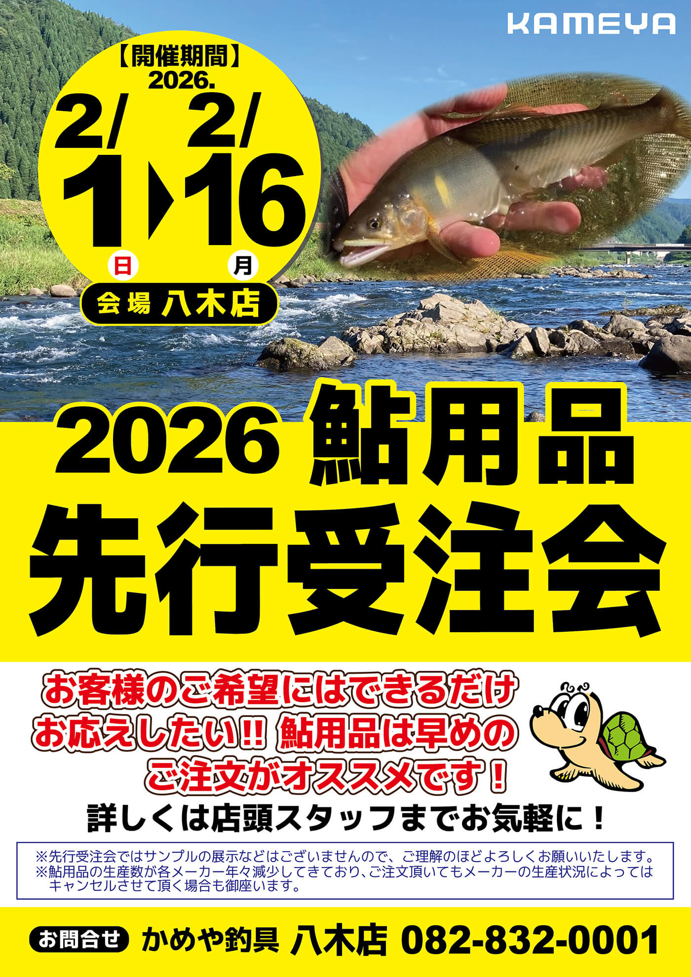 2月012026 【八木店】2026鮎用品先行受注会 イベント 開催期間 2月1日(日曜日)〜2月16日(月曜日) 開催場所 かめや釣具 八木店 参加費 ー 問い合わせ 八木店 TEL.082-832-0001