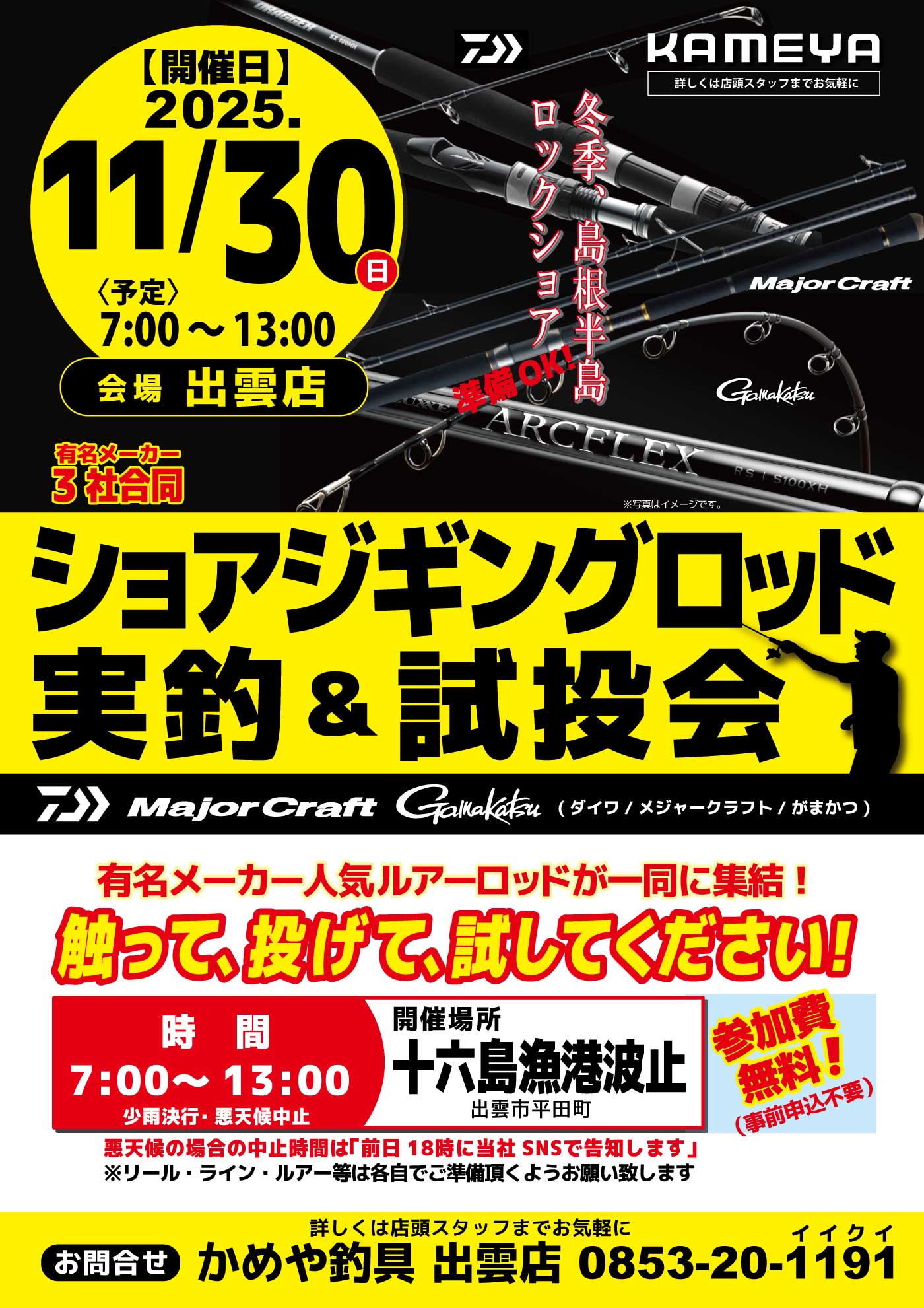 11月302025 【出雲店】3社合同ショアジギングロッド実釣&試投会 イベント 開催期間 11月30日(日曜日)〜11月30日(日曜日) 開催場所 出雲店 参加費 問い合わせ 出雲店 TEL.0853-20-1191