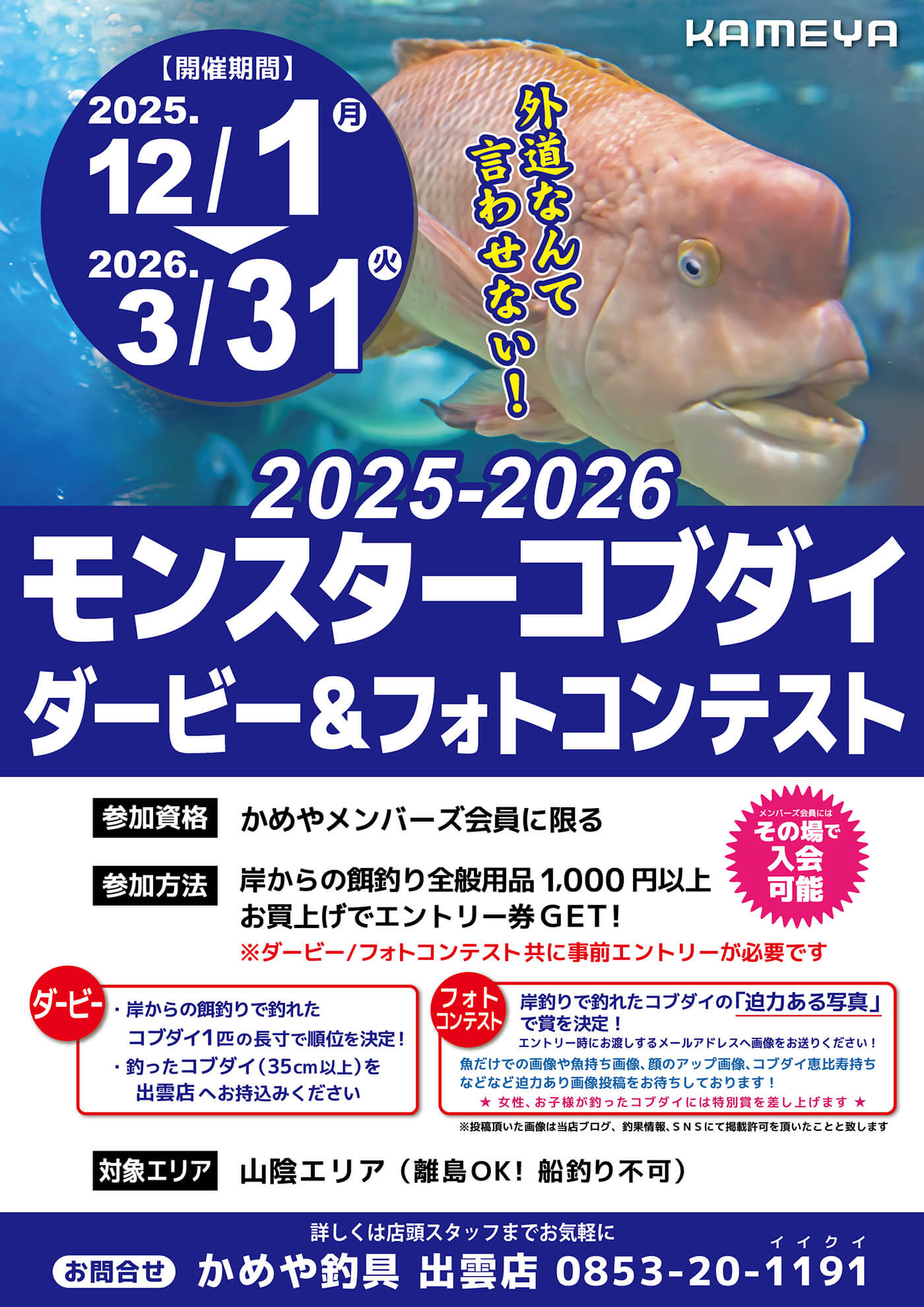 12月012025 【出雲店】2025-2026モンスターコブダイダービー&フォトコンテスト 大会・ダービー 開催期間 12月1日(月曜日)〜3月31日(火曜日) 開催場所 かめや釣具 出雲店 参加費 ー 問い合わせ 出雲店 TEL.0853-20-1191