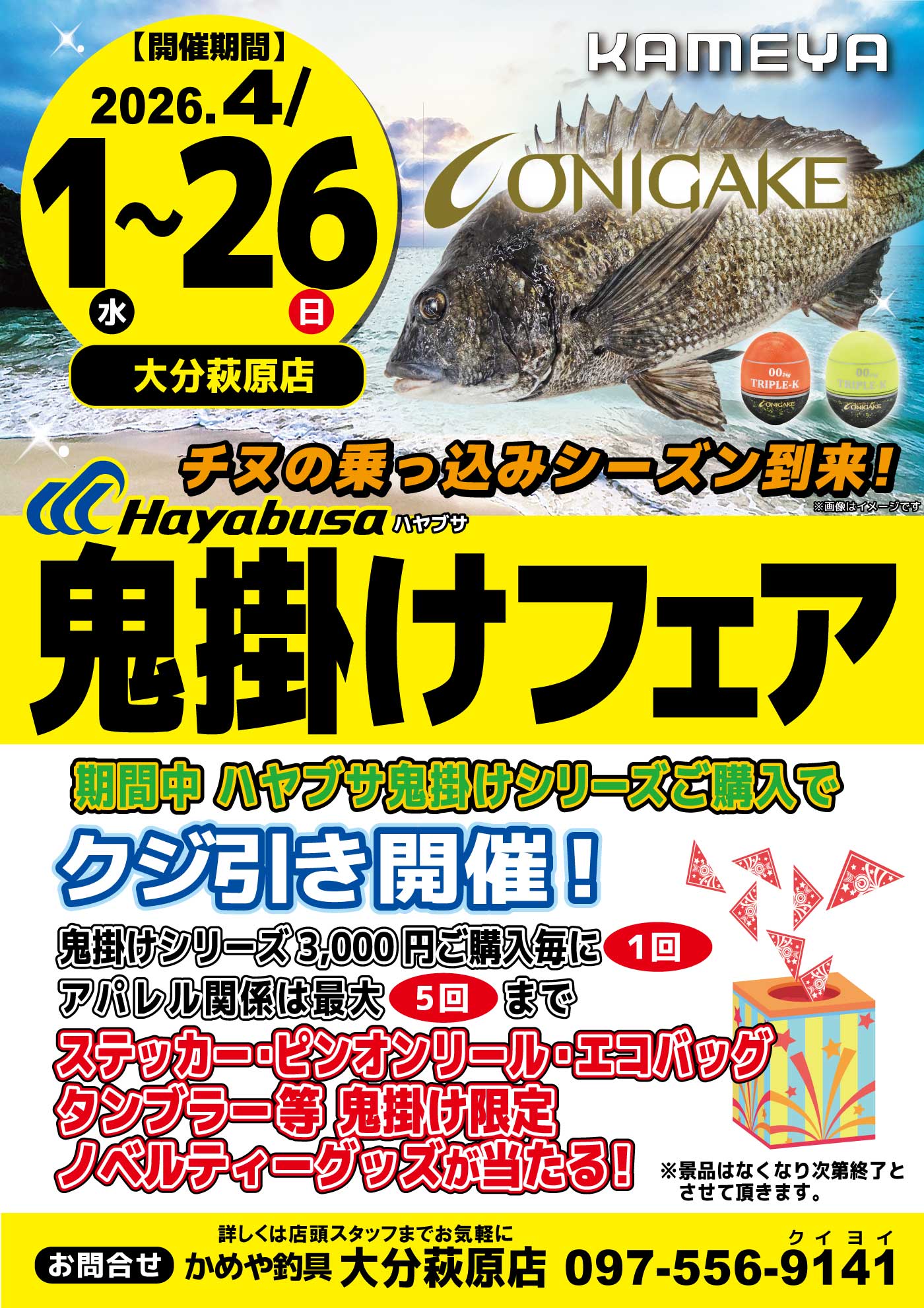 4月012026 【大分萩原店】ハヤブサ鬼掛けフェア 大分萩原店イベント 開催期間 4月1日(水曜日)〜4月26日(日曜日) 開催場所 大分萩原店 参加費 問い合わせ 大分萩原店 TEL.097-556-9141