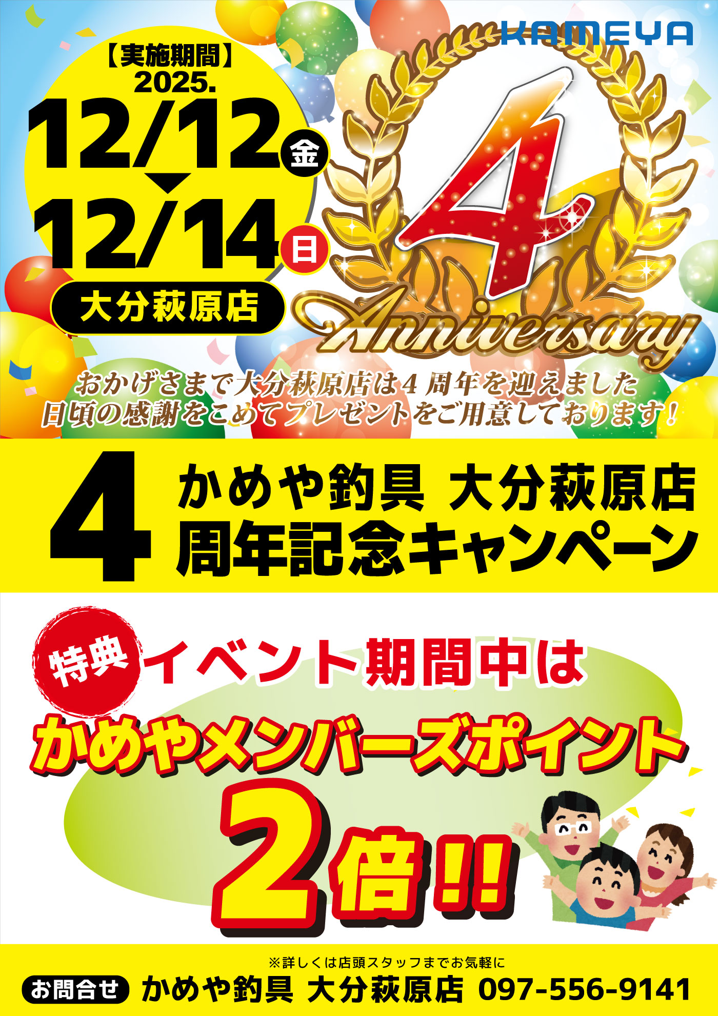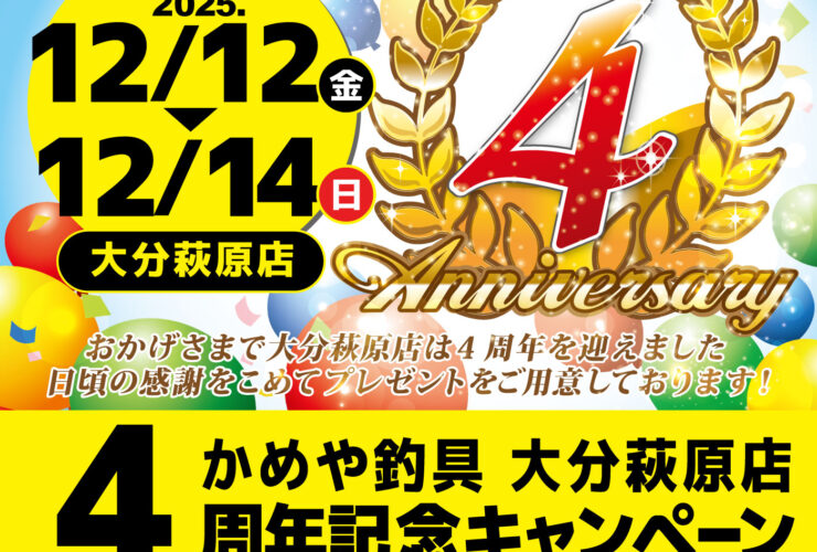 12月142025 【大分萩原店】4周年記念キャンペーン 大分萩原店イベント 開催期間 12月12日(金曜日)〜12月14日(日曜日) 開催場所 大分萩原店 参加費 - 問い合わせ 大分萩原店 TEL.097-556-9141