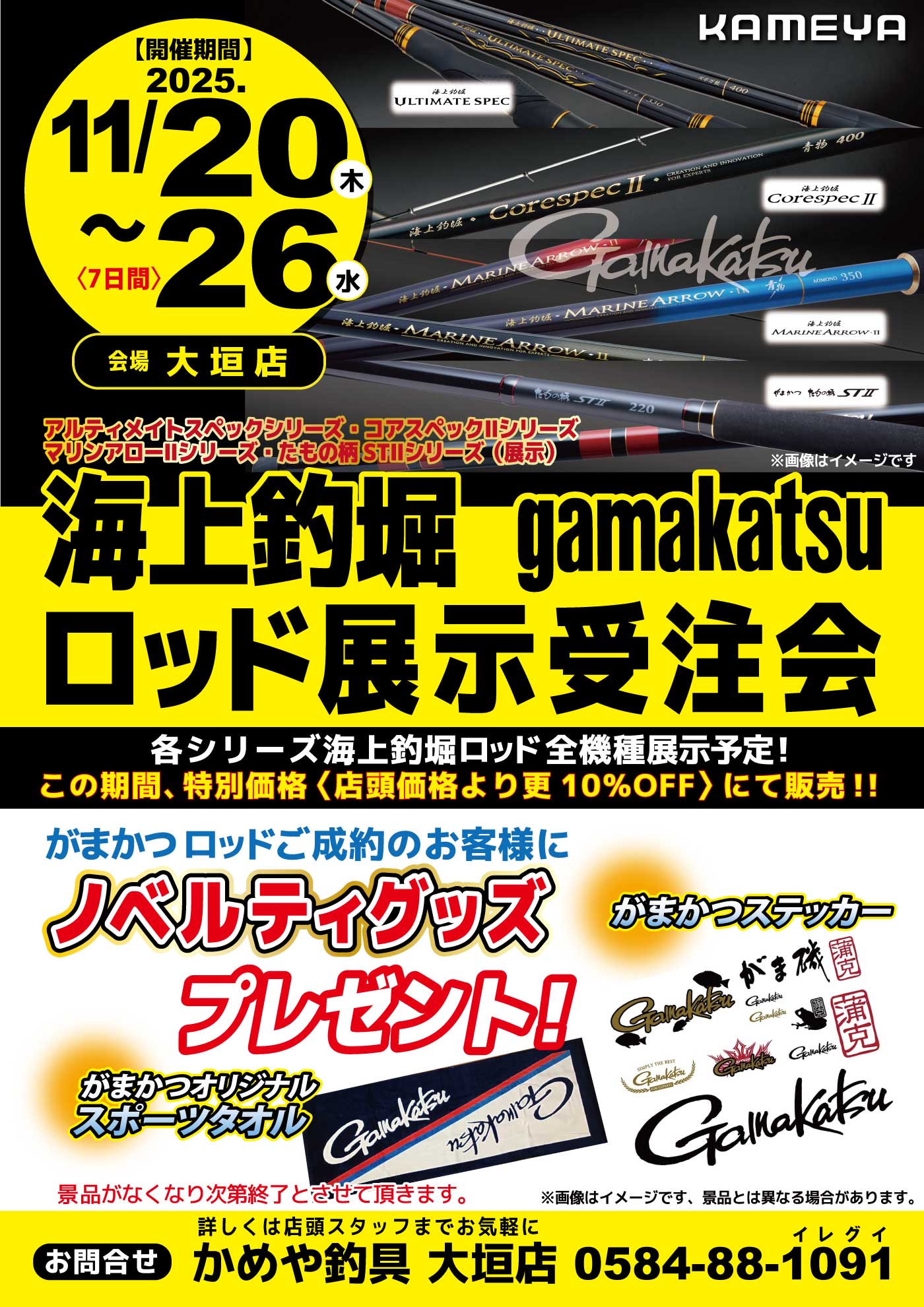 11月202025 【大垣店】がまかつ 海上釣堀ロッド展示受注会 イベント 開催期間 11月20日(木曜日)〜11月26日(水曜日) 開催場所 大垣店 参加費 問い合わせ 大垣店 TEL.0584-88-1091