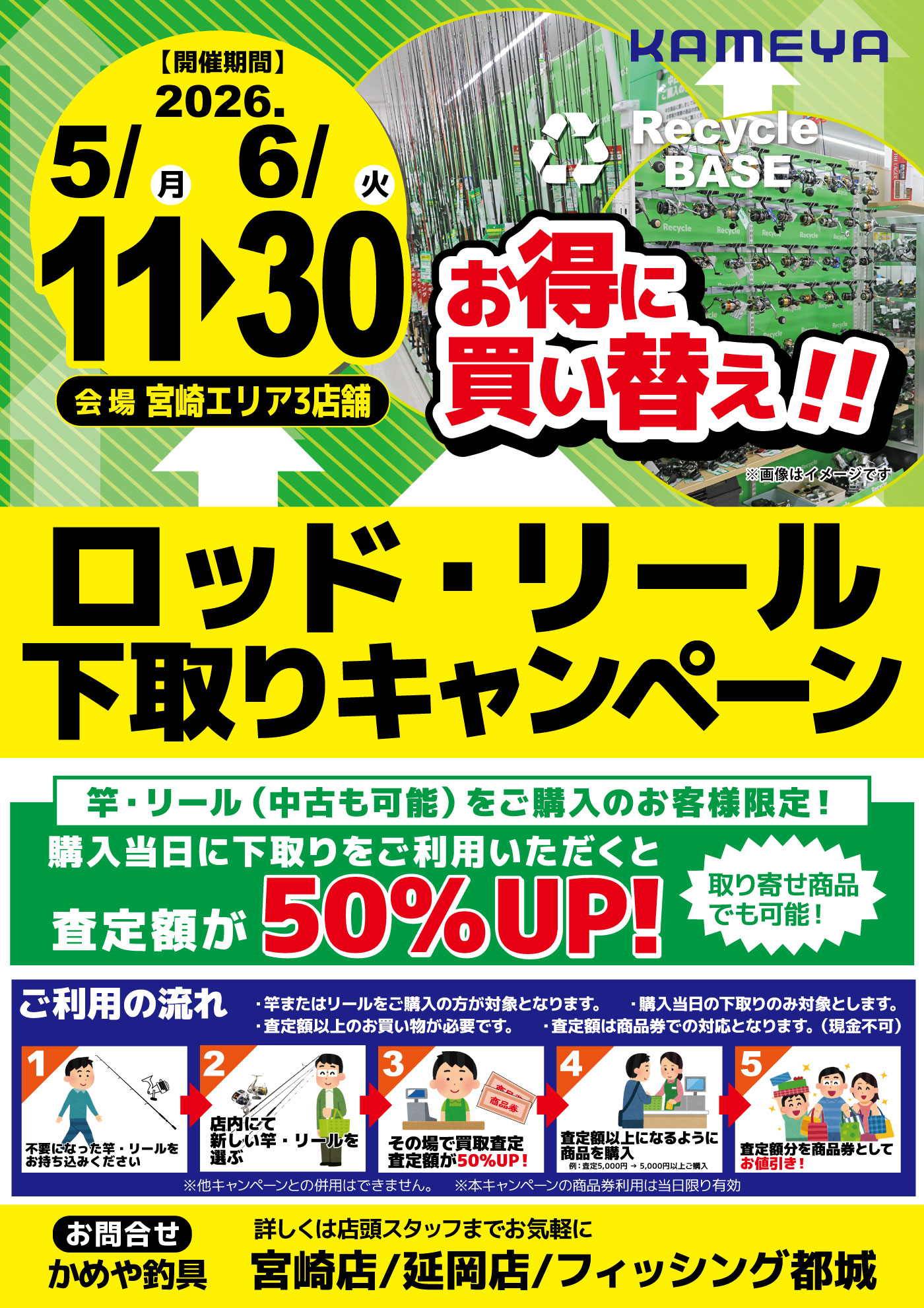 6月302026 【宮崎エリア3店舗】ロッド・リール下取りキャンペーン イベント 開催期間 5月11日(月曜日)〜6月30日(火曜日) 開催場所 かめや釣具 宮崎店/延岡店/フィッシング都城店 参加費 問い合わせ 宮崎店 TEL.0985-61-1191 、延岡店 TEL.0982-22-1091 、フィッシング都城店 TEL.0986-46-3255
