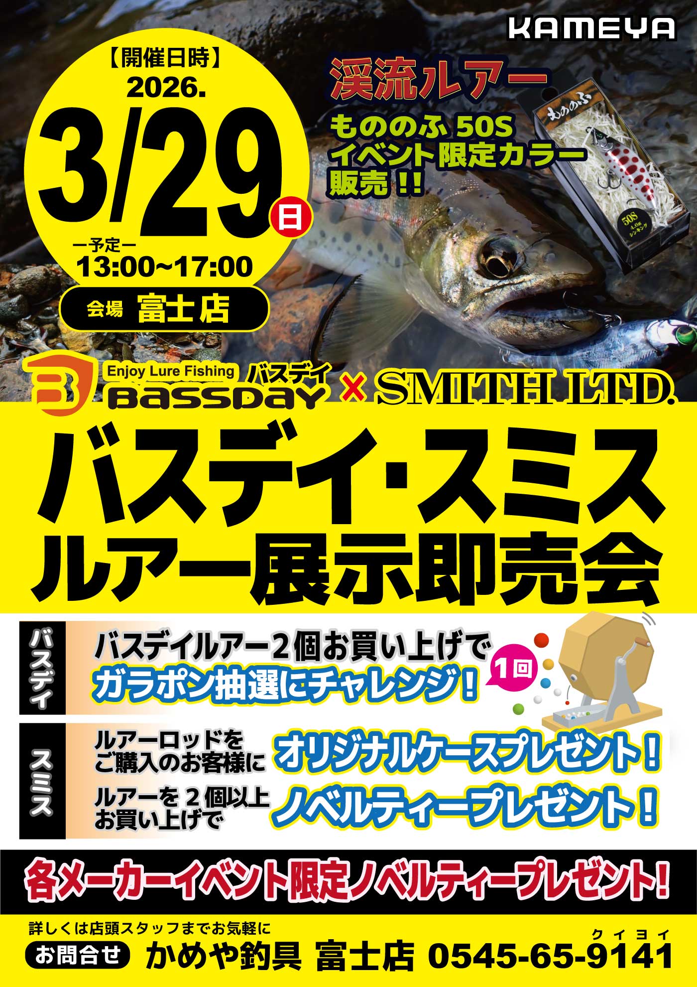 3月292026 【富士店】バスデイ・スミス ルアー展示即売会 イベント 開催期間 3月29日(日曜日)〜3月29日(日曜日) 開催場所 富士店 参加費 問い合わせ 富士店 TEL.0545-65-9141