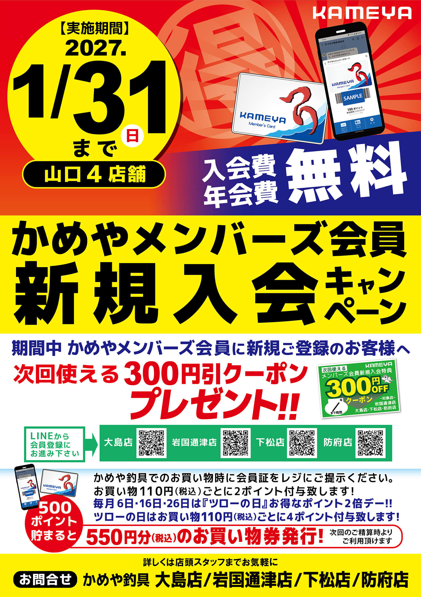 3月312026 【山口エリア】かめやメンバーズ新規入会キャンペーン2026 イベント 開催期間 〜1月31日(日曜日) 開催場所 かめや釣具 山口エリア 参加費 ー 問い合わせ 岩国通津店 TEL.0827-39-1826 、大島店 TEL.0820-79-2626 、下松店 TEL.0833-45-1091 、防府店 TEL.0835-26-6677