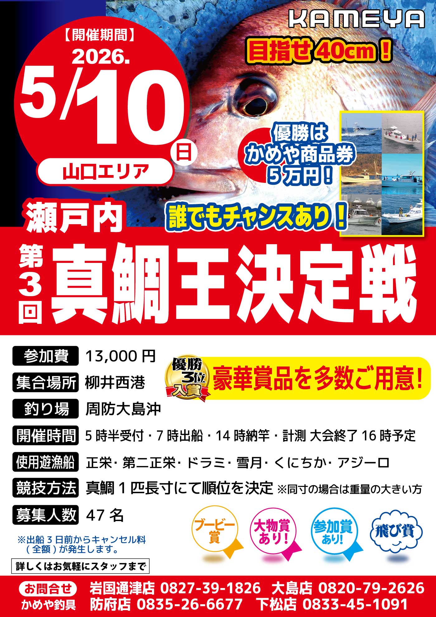 5月102026 【山口エリア全店】第3回瀬戸内真鯛王決定戦 大会・ダービー 開催期間 5月10日(日曜日)〜5月10日(日曜日) 開催場所 周防大島沖 参加費 13,000円 問い合わせ 岩国通津店 TEL.0827-39-1826 、大島店 TEL.0820-79-2626 、下松店 TEL.0833-45-1091 、防府店 TEL.0835-26-6677
