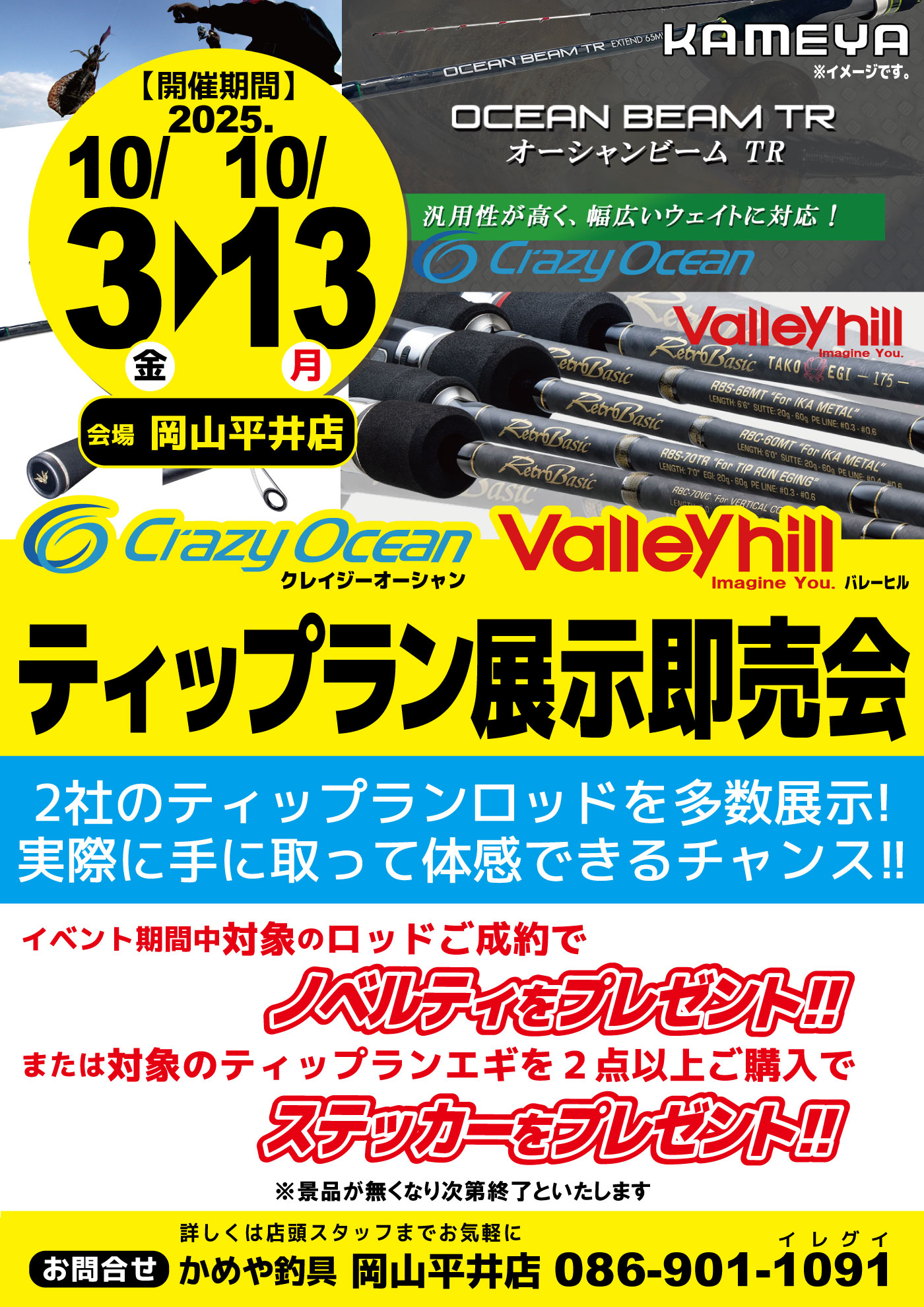 10月132025 【岡山平井店】クレイジーオーシャン・バレーヒル ティップラン展示即売会 イベント 開催期間 10月3日(金曜日)〜10月13日(月曜日) 開催場所 岡山平井店 参加費 - 問い合わせ 岡山平井店 TEL.086-901-1091