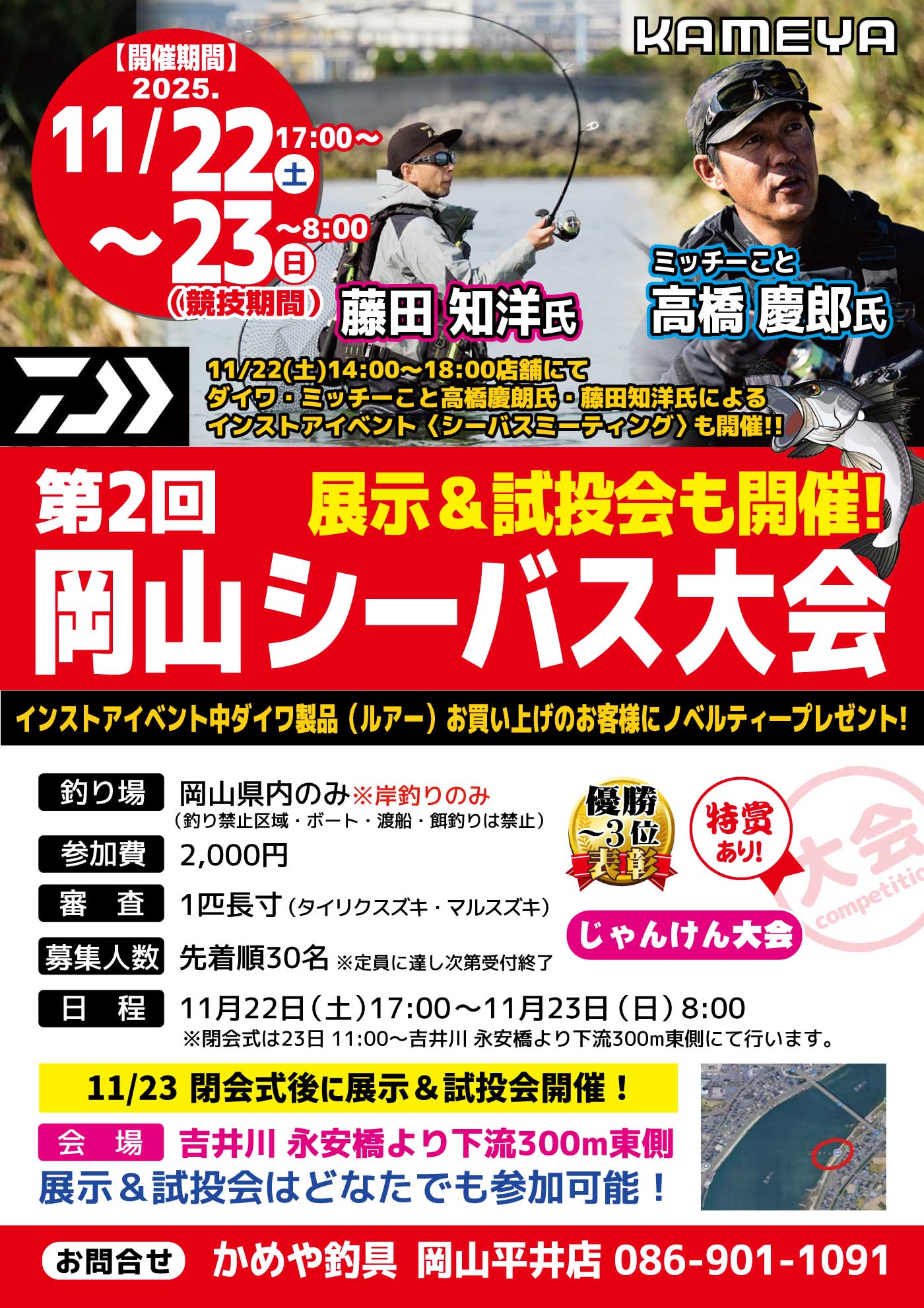 11月222025 【岡山平井店】ダイワ 第2回岡山シーバス大会(展示&試投会も開催!) 大会・ダービー 開催期間 11月22日(土曜日)〜11月23日(日曜日) 開催場所 岡山県内のみ※岸釣りのみ 参加費 2,000円 問い合わせ 岡山平井店 TEL.086-901-1091