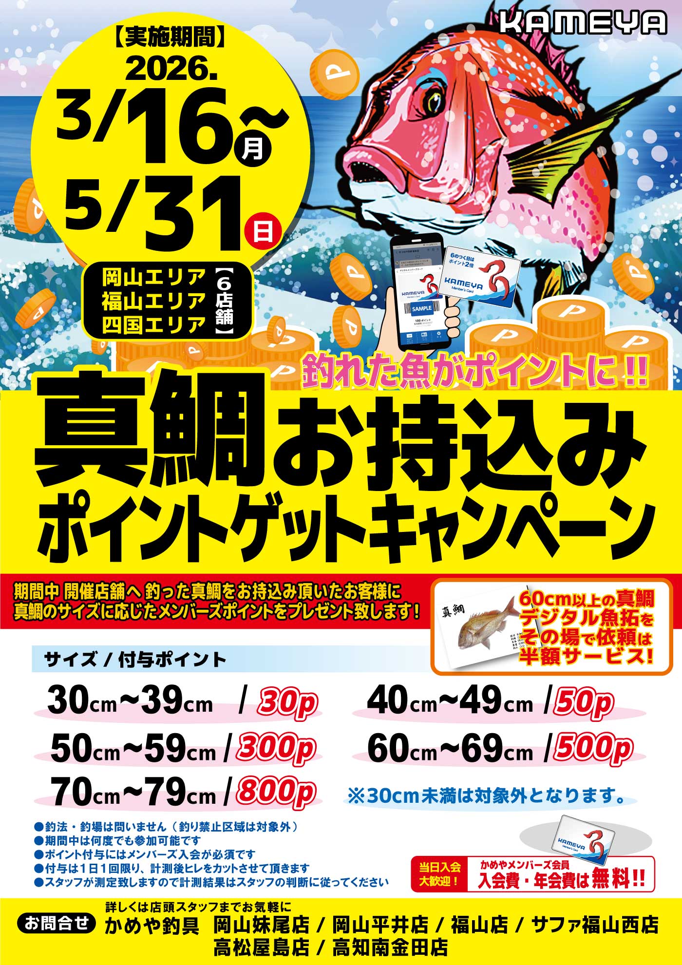 3月162026 【岡山/福山/四国エリア】真鯛お持込みポイントゲットキャンペーン 南金田店イベント 開催期間 3月17日(火曜日)〜5月31日(日曜日) 開催場所 岡山/福山/四国エリア 参加費 問い合わせ 岡山妹尾店 TEL.086-209-1091 、岡山平井店 TEL.086-901-1091 、福山店 TEL.084-943-1091 、サファ福山西店 TEL.084-949-1091 、高松屋島店 TEL.087-843-9141 、南金田店 TEL.088-883-1091