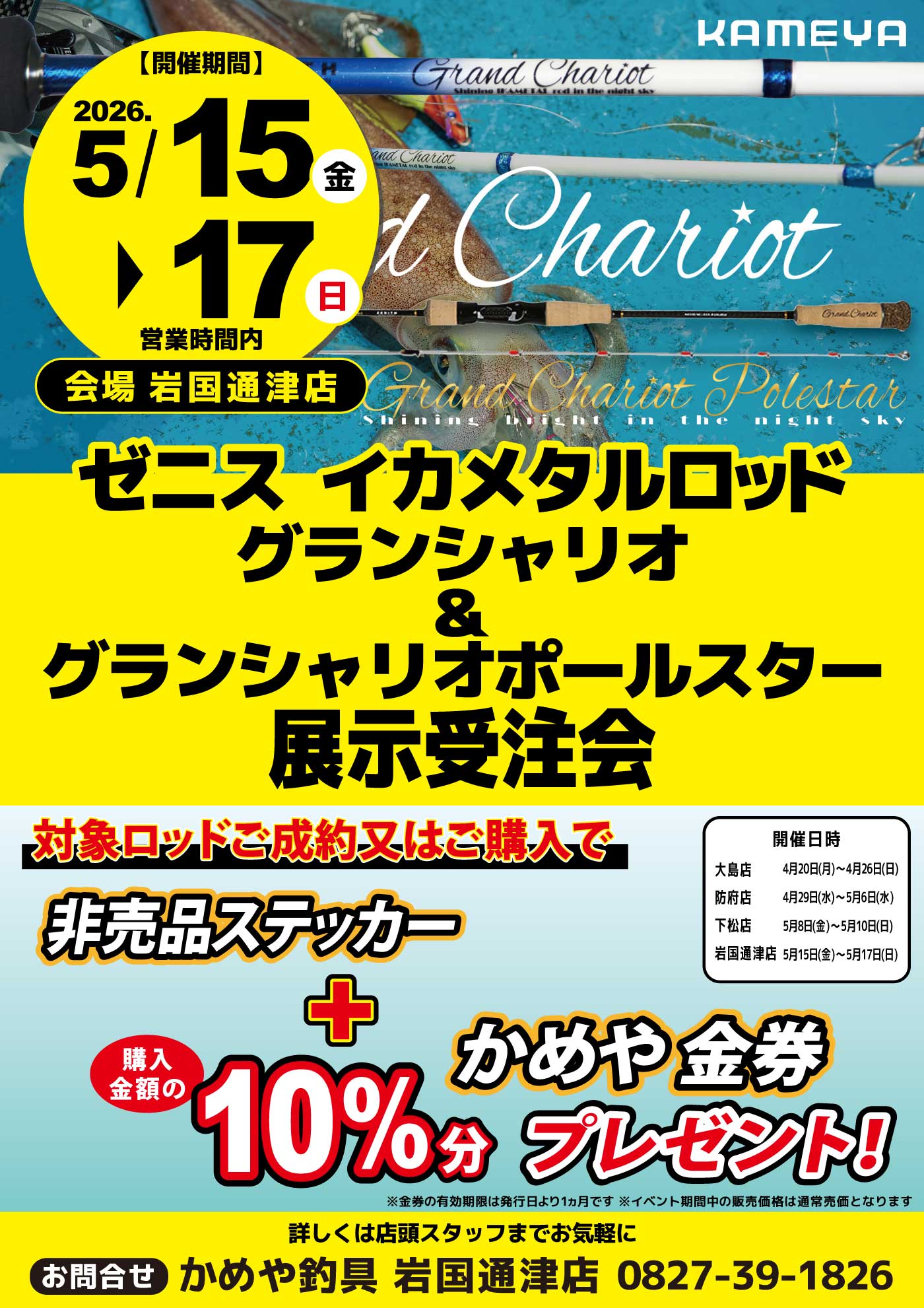 5月172026 【岩国通津店】ゼニス イカメタルロッド グランシャリオ&グランシャリオポールスター展示受注会 イベント 開催期間 5月15日(金曜日)〜5月17日(日曜日) 開催場所 かめや釣具 岩国通津店 参加費 問い合わせ 岩国通津店 TEL.0827-39-1826