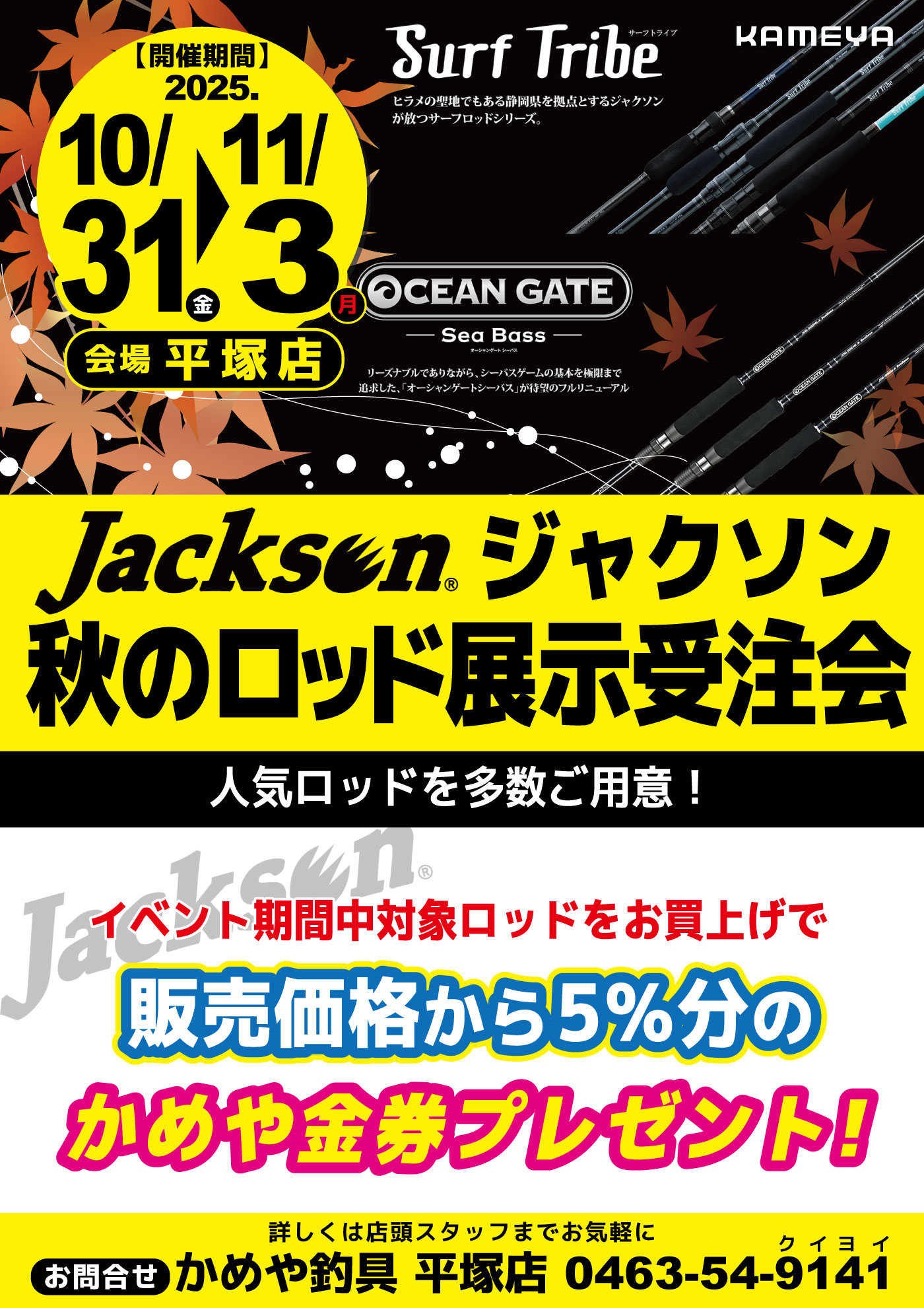 11月032025 【平塚店】ジャクソン秋のロッド展示受注会 イベント 開催期間 10月31日(金曜日)〜11月3日(月曜日) 開催場所 平塚店 参加費 - 問い合わせ 平塚店 TEL.0463-54-9141