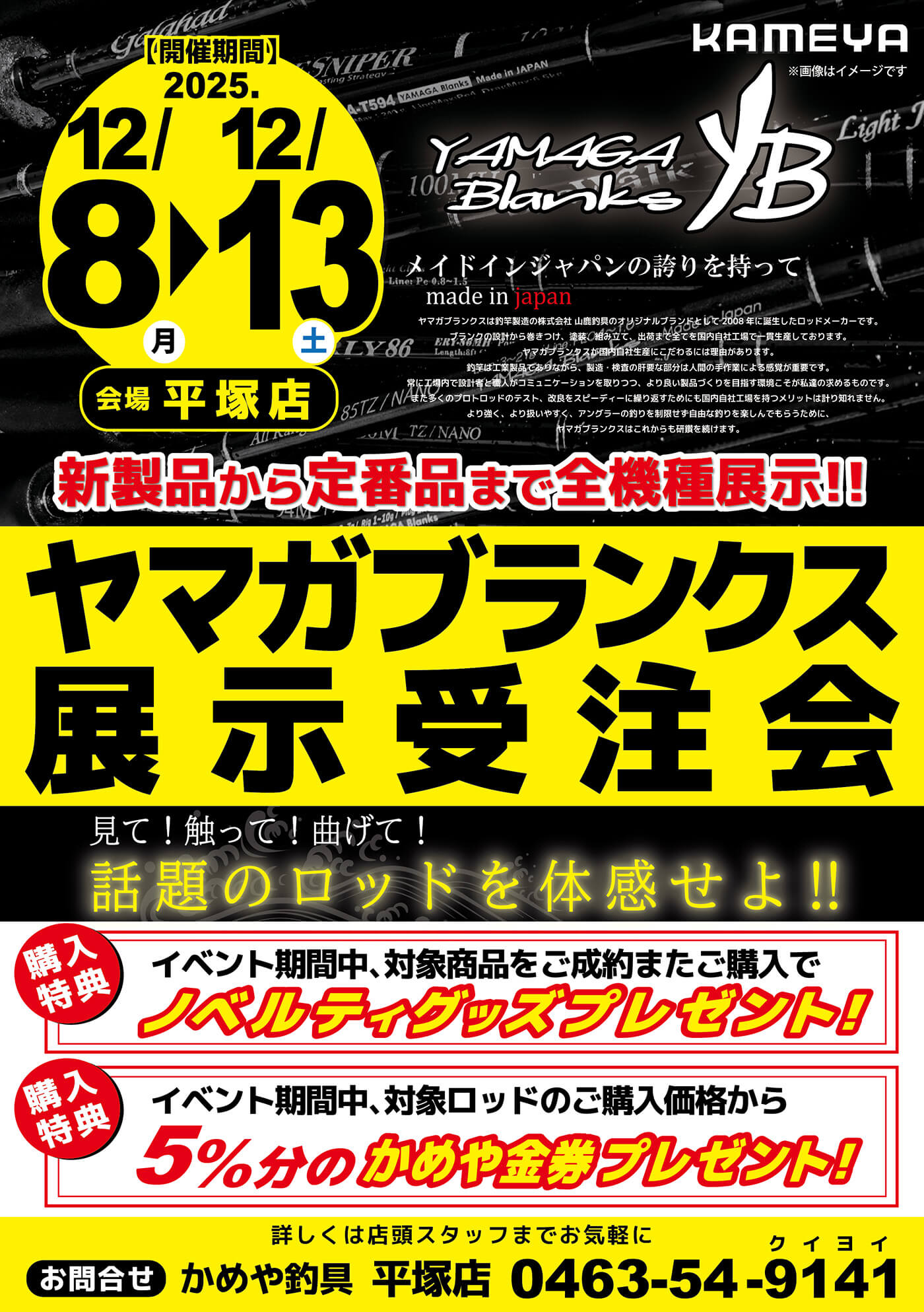 12月082025 【平塚店】ヤマガブランクス展示受注会 イベント 開催期間 12月8日(月曜日)〜12月13日(土曜日) 開催場所 かめや釣具 平塚店 参加費 ー 問い合わせ 平塚店 TEL.0463-54-9141