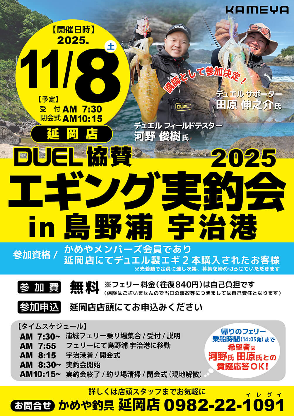 11月082025 【延岡店】エギング実釣会in島野浦 宇治港2025 イベント 開催期間 11月8日(土曜日)7:30~11:00 開催場所 島野浦 宇治港 参加費 ー 問い合わせ 延岡店 TEL.0982-22-1091