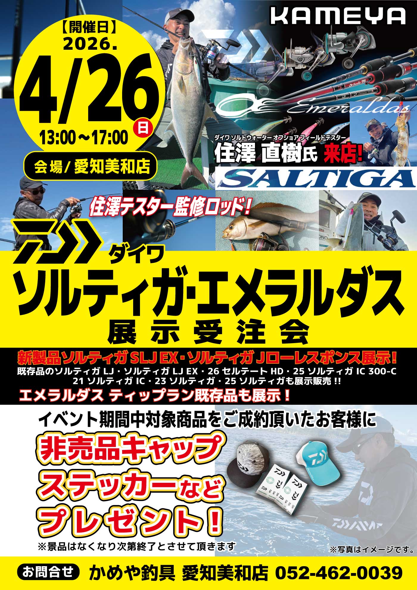 4月262026 【愛知美和店】ダイワソルティガ・エメラルダス展示受注会 イベント 開催期間 4月26日(日曜日)〜4月26日(日曜日) 開催場所 愛知美和店 参加費 問い合わせ 愛知美和店 TEL.052-462-0039