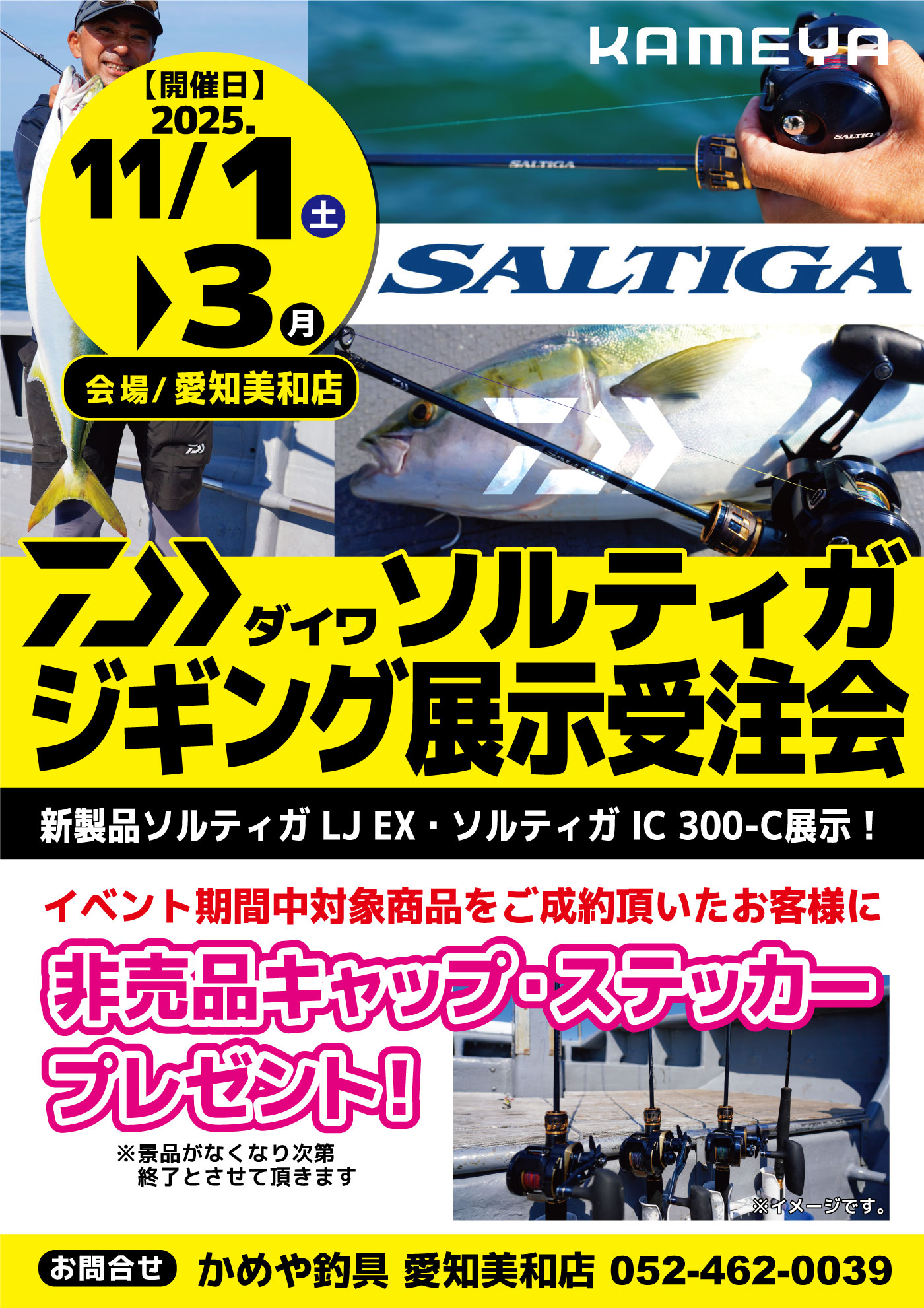 11月032025 【愛知美和店】ダイワ ソルティガ ジギング展示受注会 イベント 開催期間 11月1日(土曜日)〜11月3日(月曜日) 開催場所 愛知美和店 参加費 - 問い合わせ 愛知美和店 TEL.052-462-0039