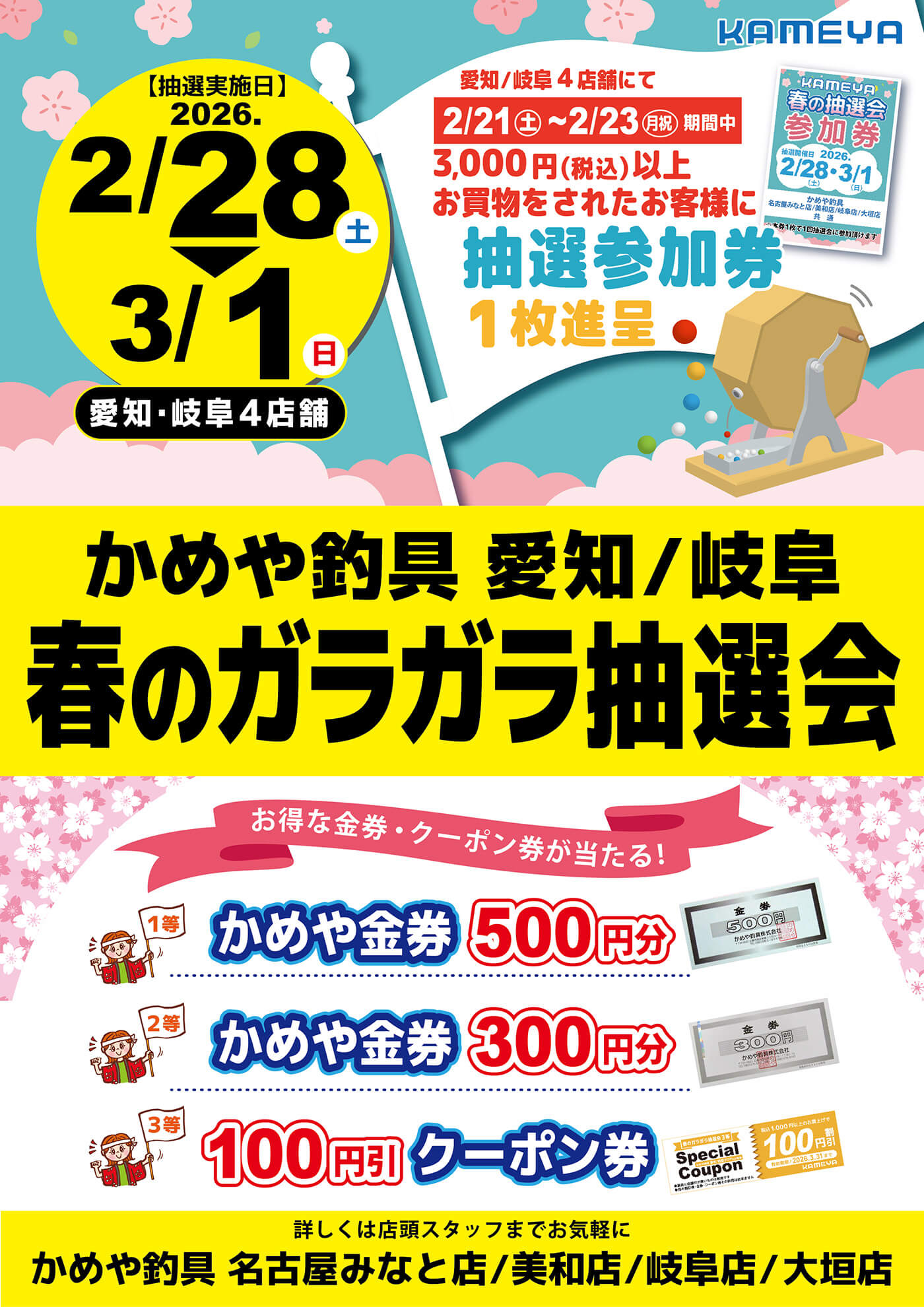 2月212026 【愛知/岐阜】春のガラガラ抽選会 参加券配布 イベント 開催期間 2月21日(土曜日)〜2月23日(月曜日) 開催場所 かめや釣具 愛知・岐阜 4店舗 参加費 ー 問い合わせ 岐阜店 TEL.058-296-1191 、大垣店 TEL.0584-88-1091 、愛知美和店 TEL.052-462-0039 、名古屋みなと店 TEL.052-661-9141