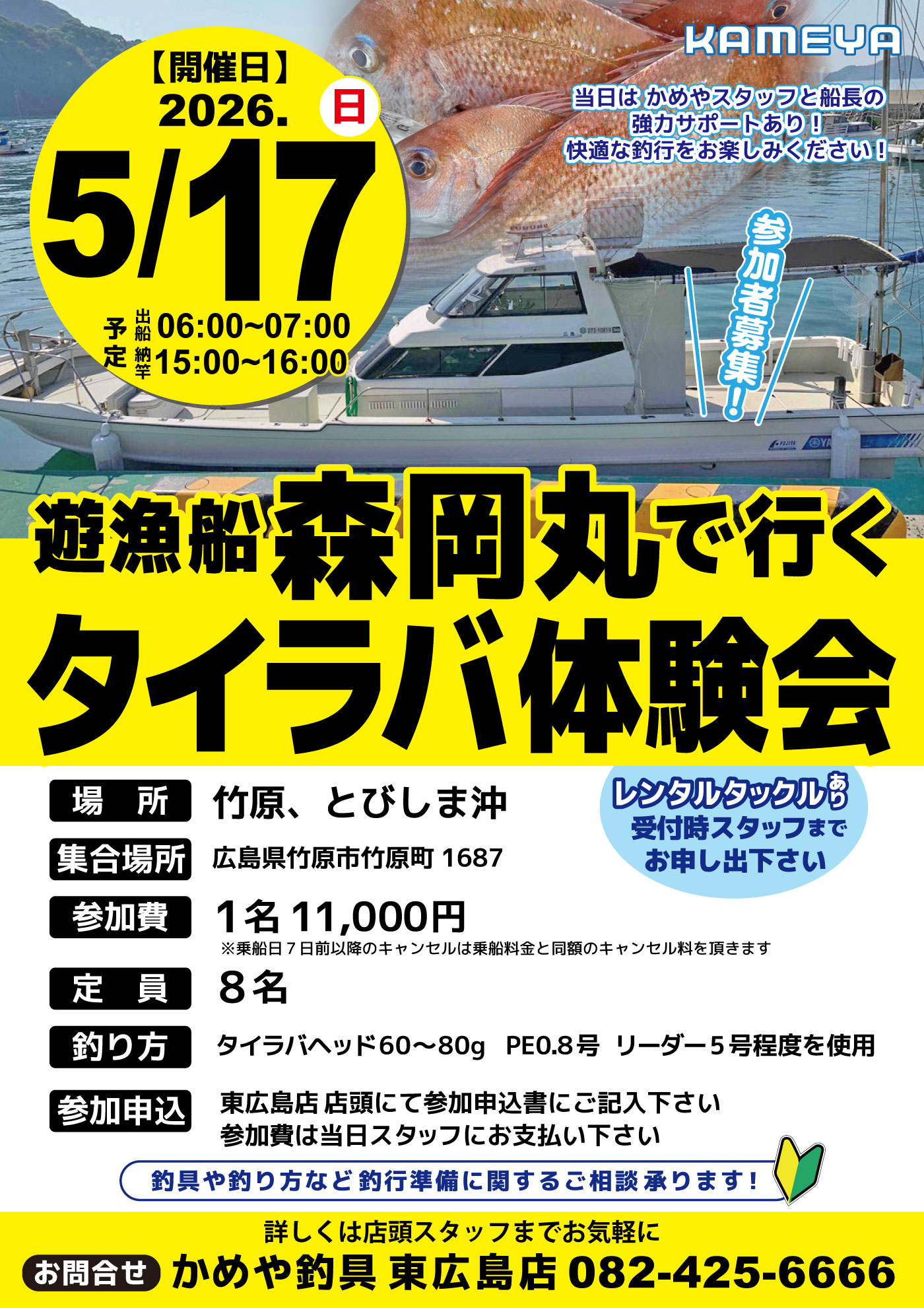 5月172026 【東広島店】遊漁船 森岡丸で行く!タイラバ体験会 イベント 開催期間 5月17日(日曜日)6:00~16:00 開催場所 東広島店 参加費 11,000円 問い合わせ 東広島店 TEL.082-425-6666