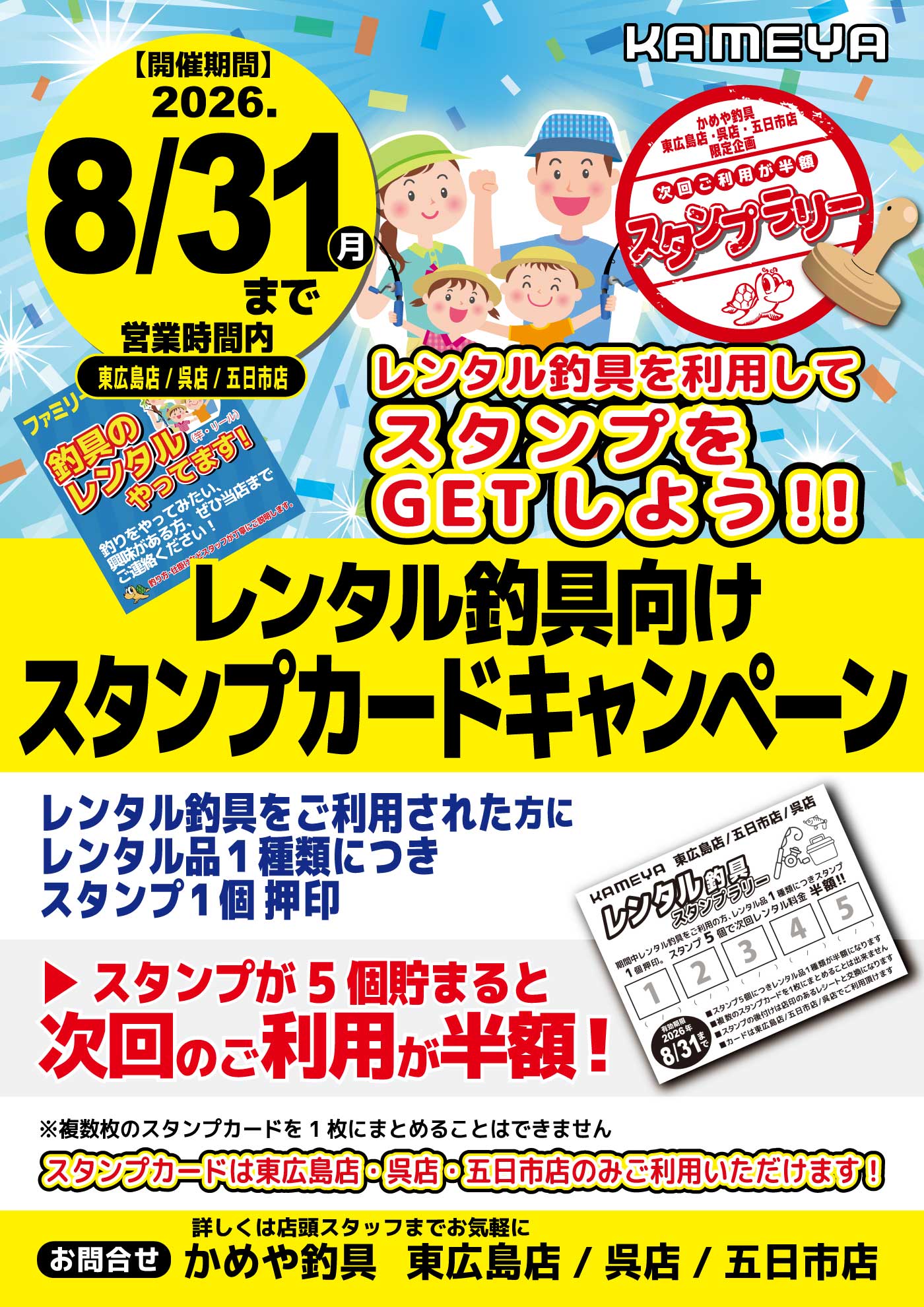 2月202026 【東広島店/呉店/五日市店】レンタル釣具向けスタンプカードキャンペーン イベント 開催期間 2月20日(金曜日)〜8月31日(月曜日) 開催場所 東広島店/呉店/五日市店 参加費 問い合わせ 東広島店 TEL.082-425-6666 、呉店 TEL.0823-76-0888 、五日市店 TEL.082-943-9141