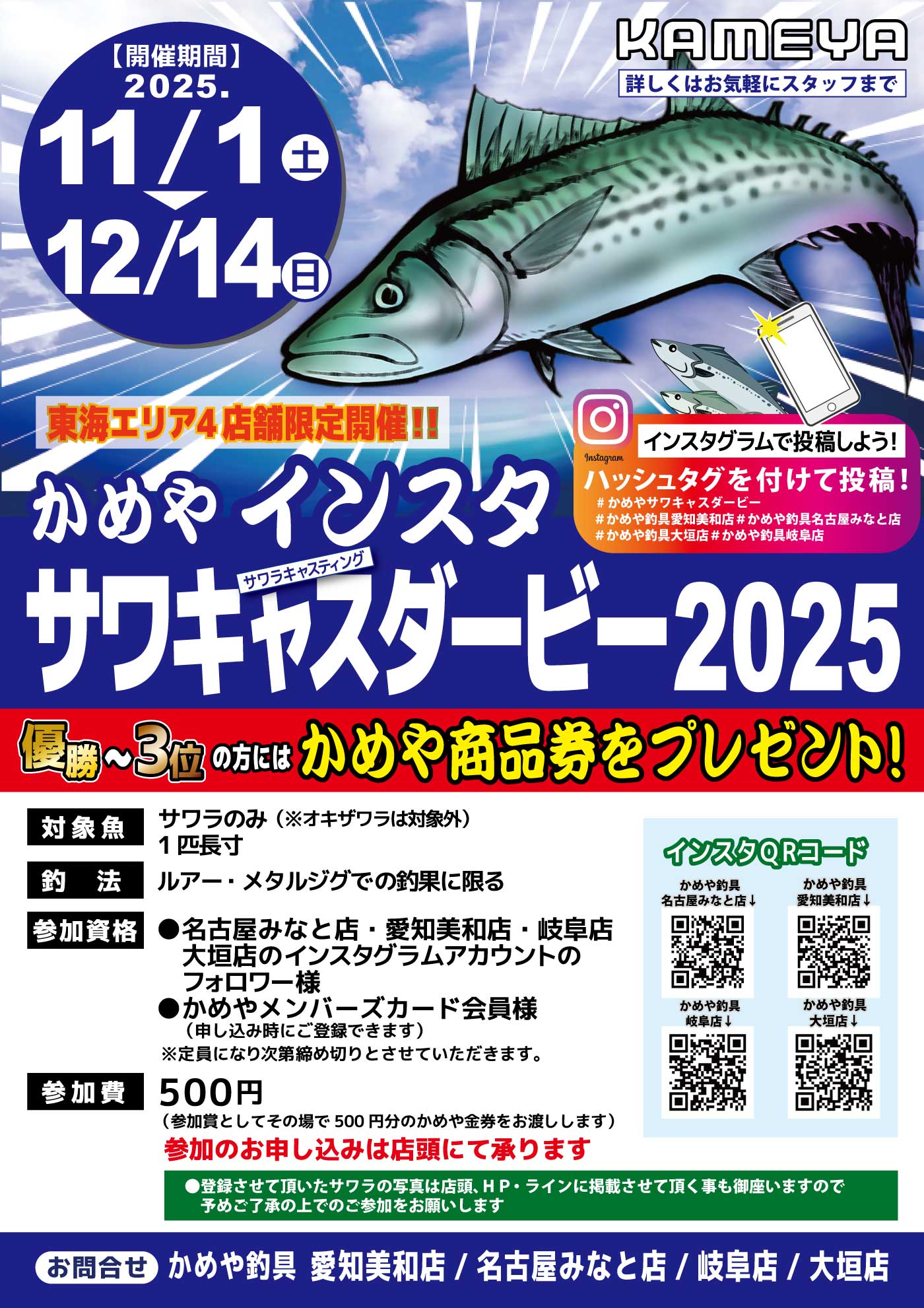 11月012025 【東海エリア4店舗】かめやインスタサワキャスダービー2025 みなと 開催期間 11月1日(土曜日)〜12月14日(日曜日) 開催場所 愛知美和店/名古屋みなと店/岐阜店/大垣店 参加費 500円 問い合わせ 愛知美和店 TEL.052-462-0039 、名古屋みなと店 TEL.052-661-9141 、岐阜店 TEL.058-296-1191 、大垣店 TEL.0584-88-1091