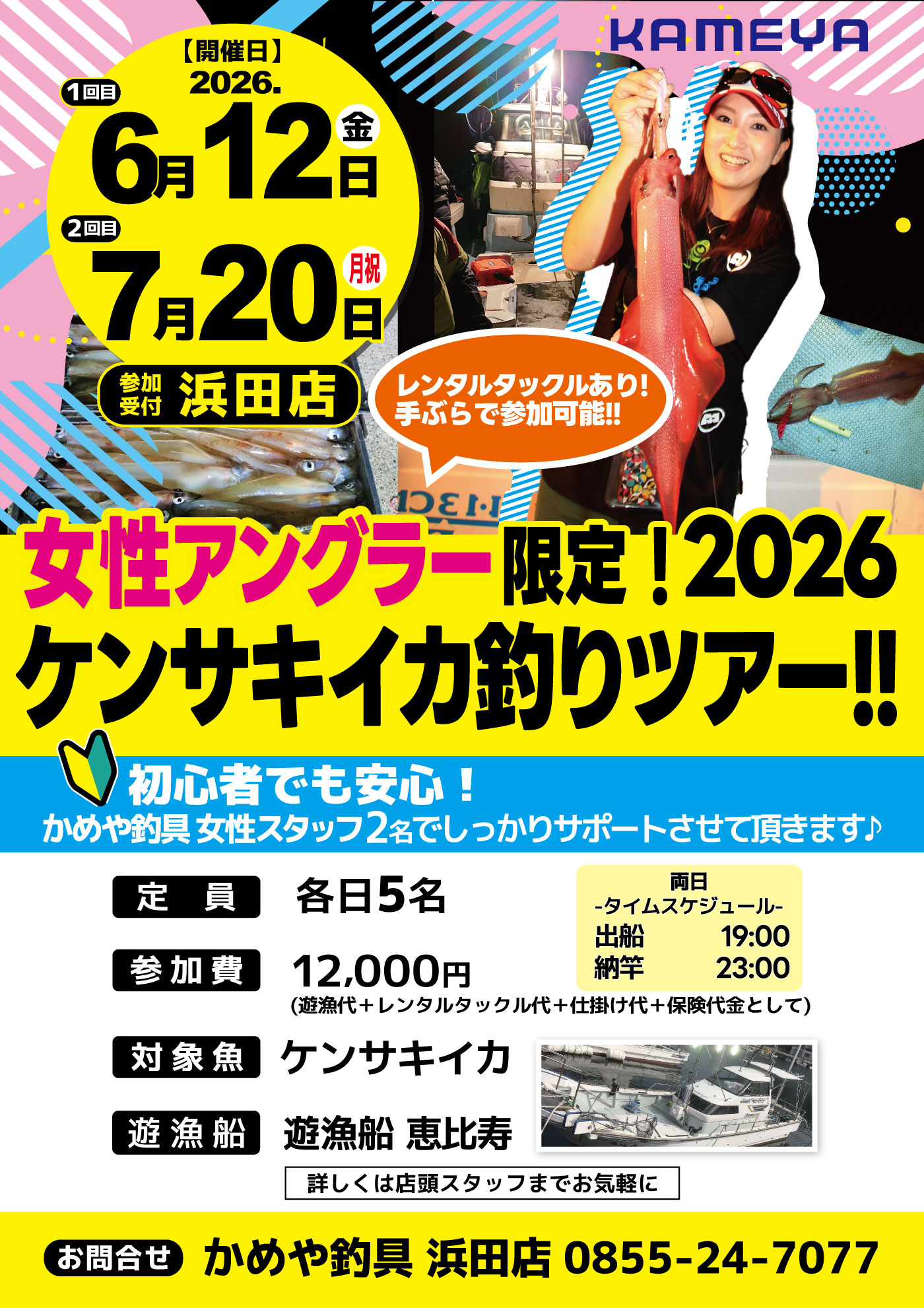 7月202026 【浜田店】女性限定 ケンサキイカ釣りツアー2026 イベント 開催期間 7月20日(月曜日)19:00~23:00 受付店舗 かめや釣具 浜田店 参加費 12,000円 問い合わせ 浜田店 TEL.0855-24-7077