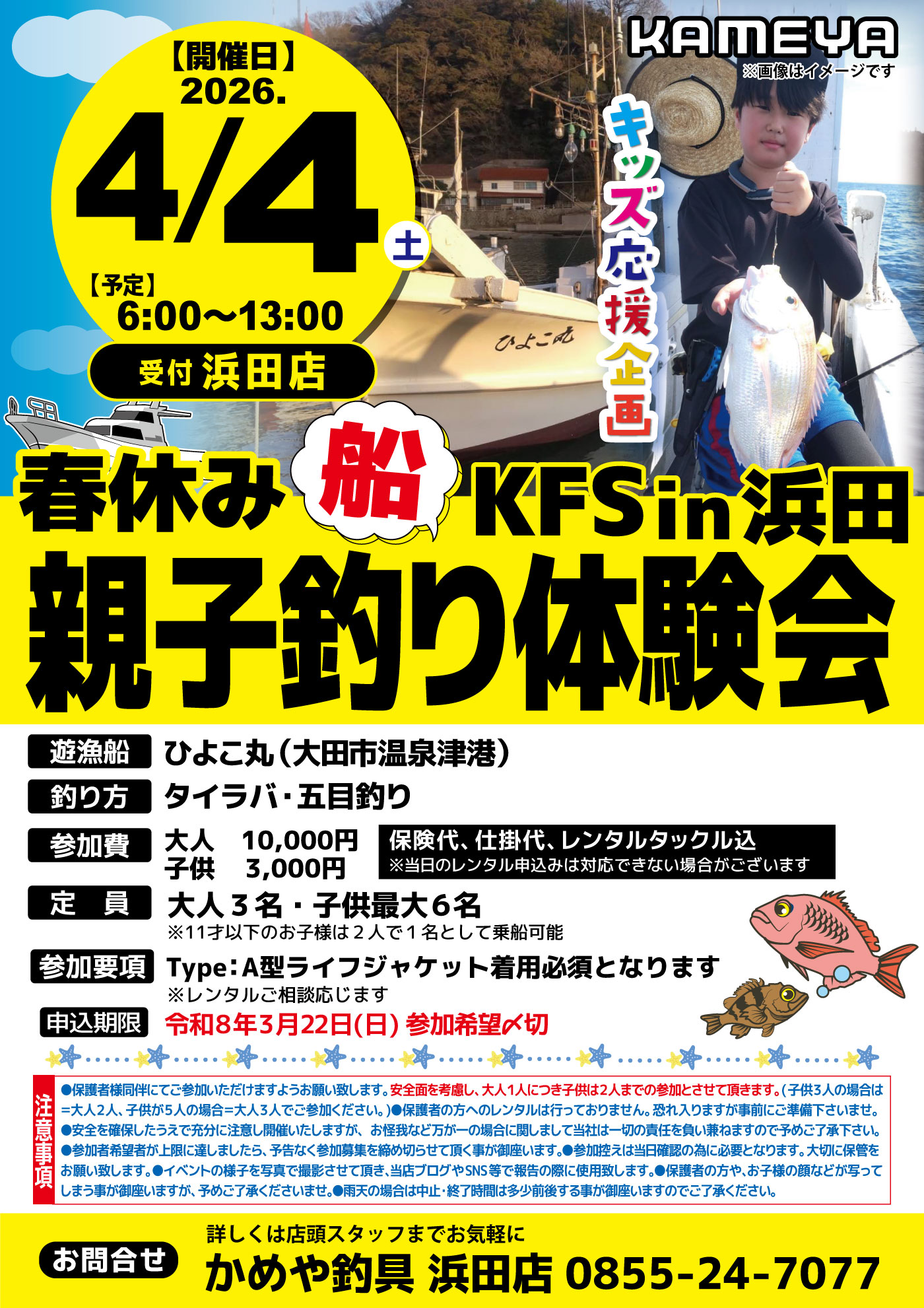 4月042026 【浜田店】春休み親子船釣り体験会KFSin浜田 イベント 開催期間 4月4日(土曜日)6:00~13:00 開催場所 浜田店 参加費 大人10,000円、子供3,000円 問い合わせ 浜田店 TEL.0855-24-7077
