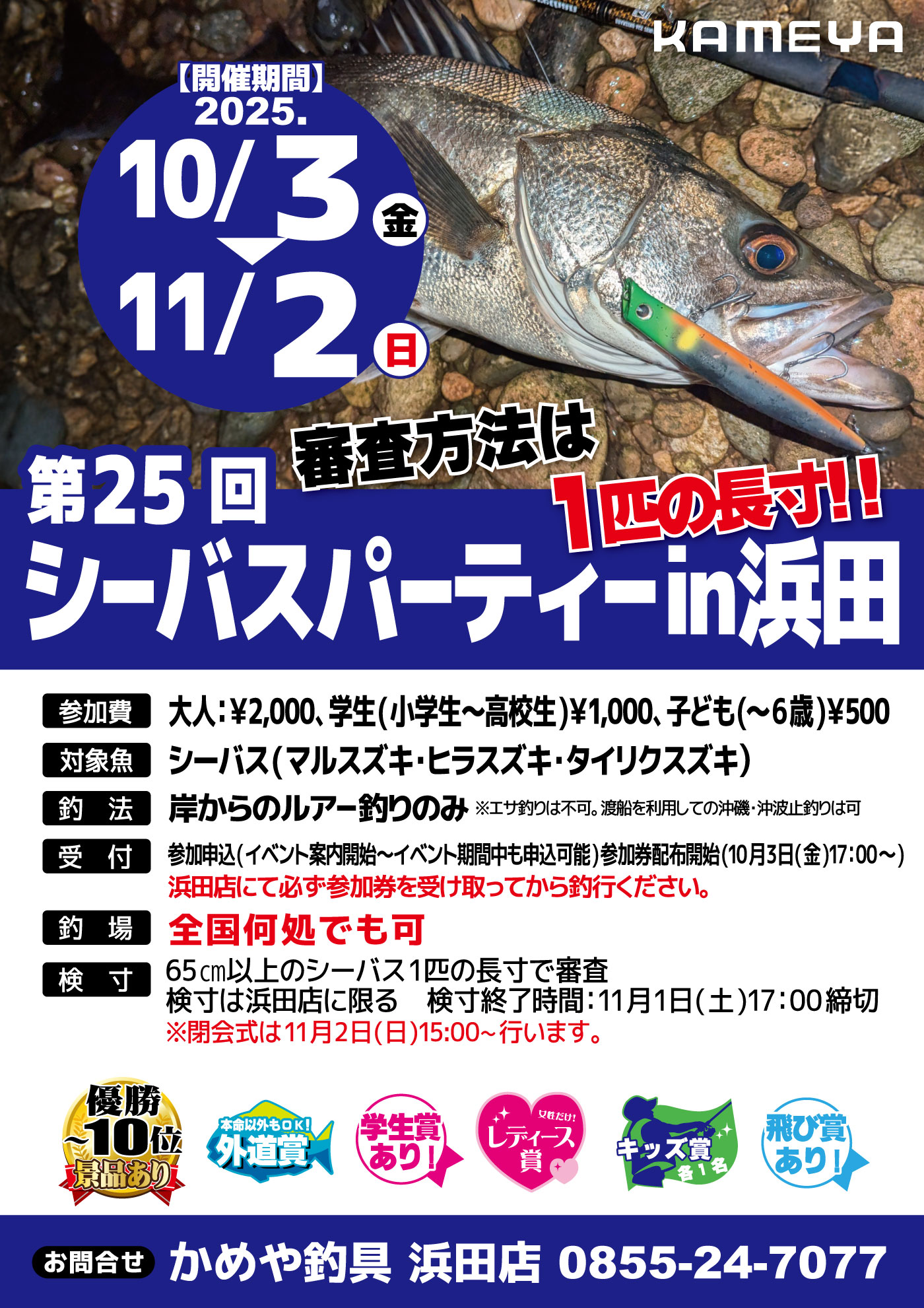 11月022025 【浜田店】第25回シーバスパーティー 大会・ダービー 開催期間 10月3日(金曜日)〜11月2日(日曜日) 開催場所 参加費 問い合わせ 浜田店 TEL.0855-24-7077 、浜田店 TEL.0855-24-7077