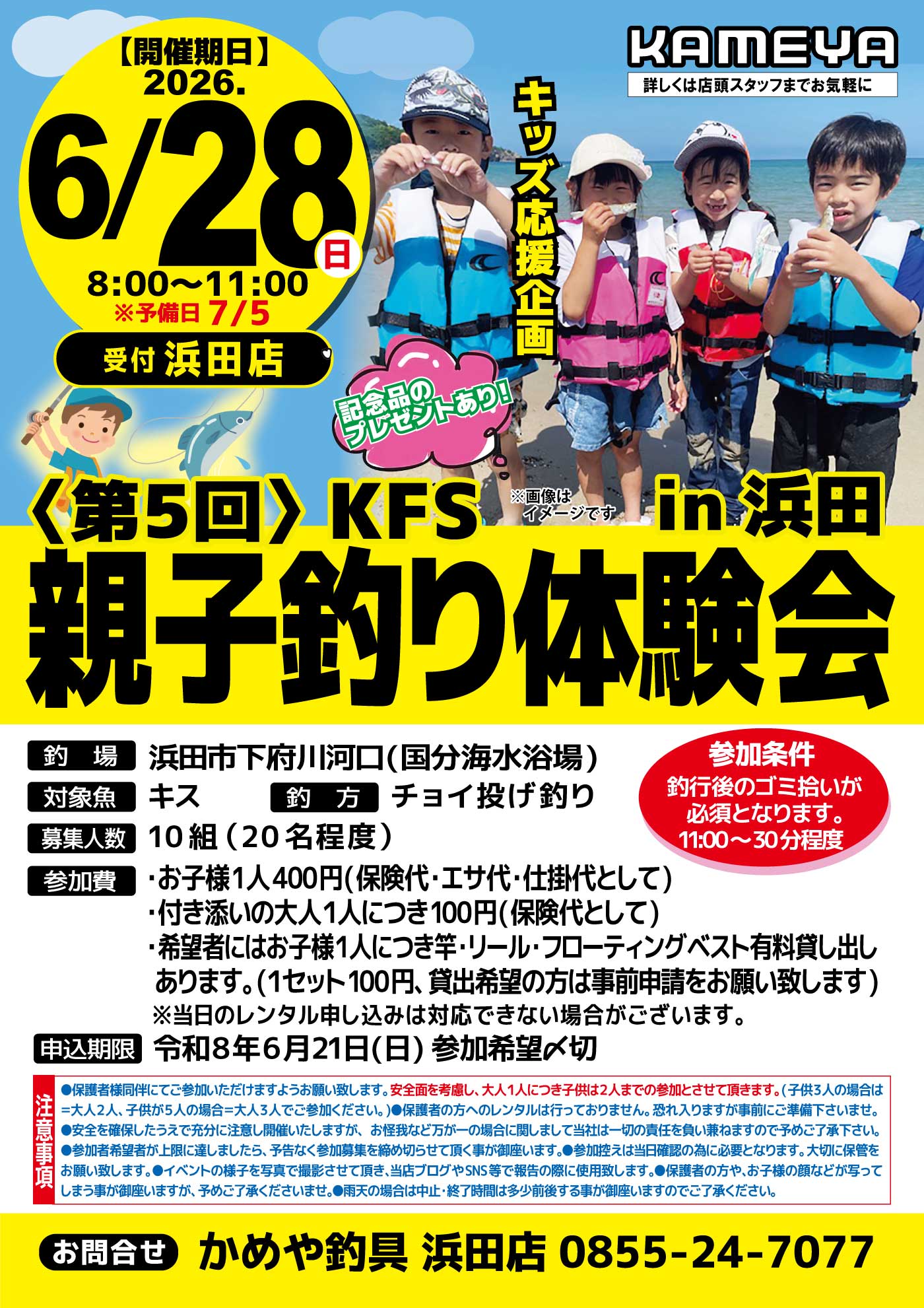 6月282026 【浜田店】第5回KFS親子釣り体験会in浜田 イベント 開催期間 6月28日(日曜日)〜6月28日(日曜日) 開催場所 浜田氏下府川河口(国分海水浴場) 参加費 お子様1人400円 付き添い大人1人100円 問い合わせ 浜田店 TEL.0855-24-7077