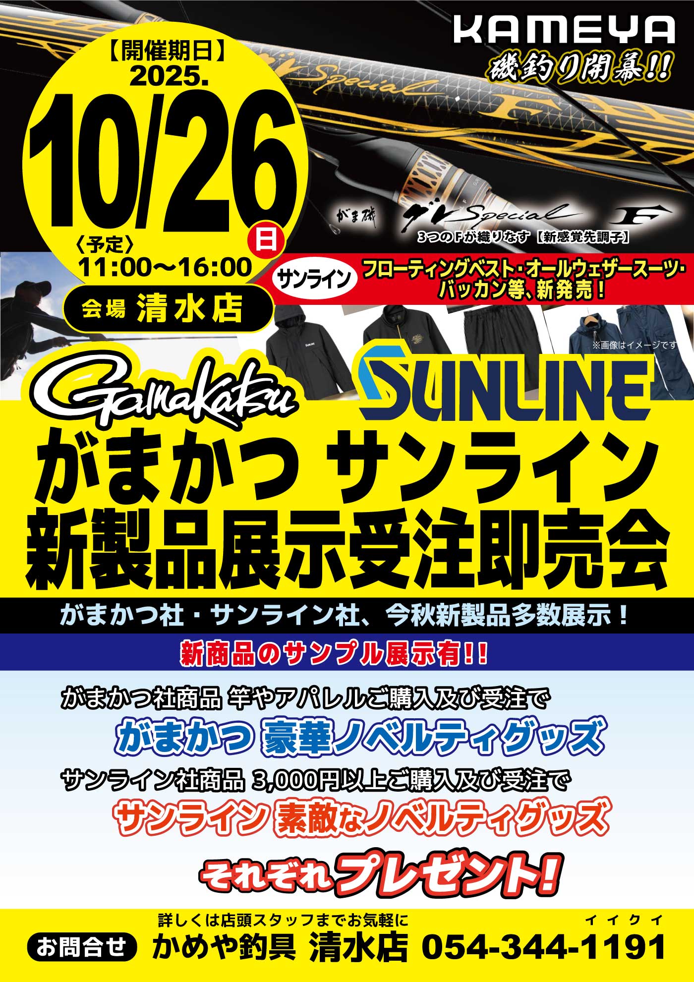 10月262025 【清水店】がまかつ/サンライン新製品展示受注即売会 イベント 開催期間 10月26日(日曜日)〜10月26日(日曜日) 開催場所 清水店 参加費 問い合わせ 清水店 TEL.054-344-1191