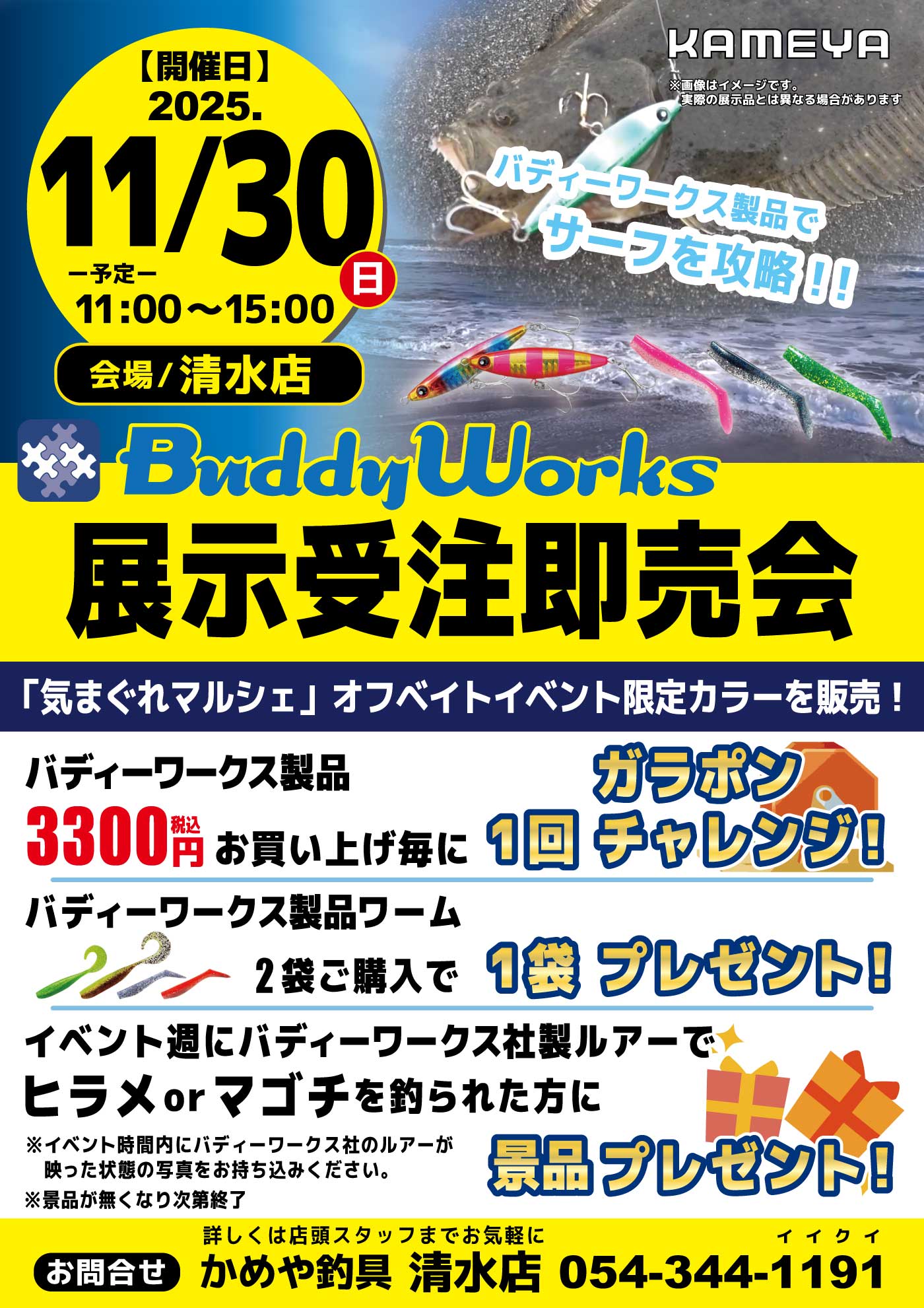 11月302025 【清水店】バディーワークス展示受注即売会 イベント 開催期間 11月30日(日曜日)11:00~15:00 開催場所 かめや釣具 清水店 参加費 問い合わせ 清水店 TEL.054-344-1191