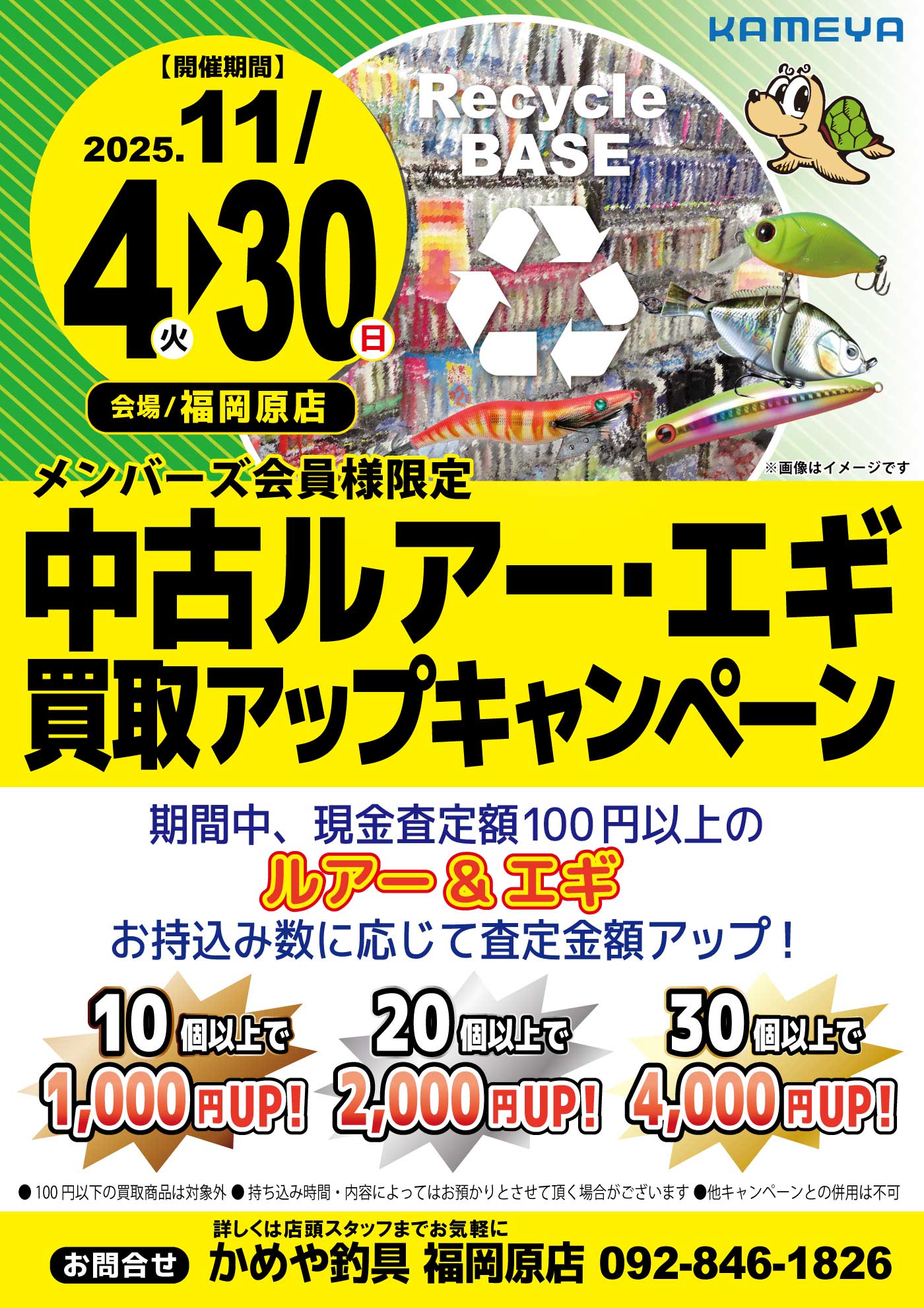 11月042025 【福岡原店】中古ルアー・エギ買取アップキャンペーン イベント 開催期間 11月4日(火曜日)〜11月30日(日曜日) 開催場所 福岡原店 参加費 問い合わせ 福岡原店 TEL.092-846-1826