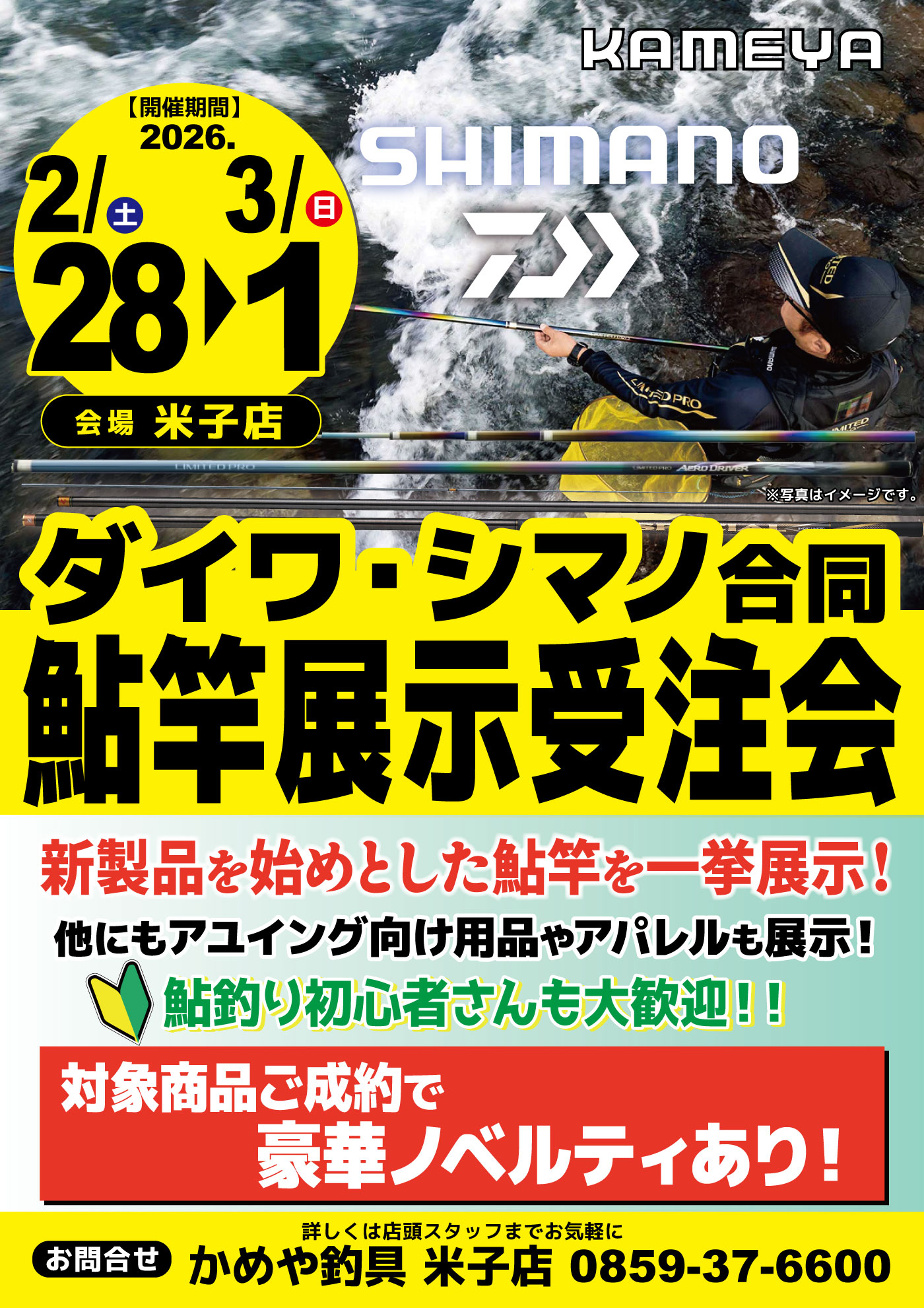 3月012026 【米子店】ダイワ・シマノ合同 鮎竿展示受注会 イベント 開催期間 2月28日(土曜日)〜3月1日(日曜日) 開催場所 かめや釣具 米子店 参加費 問い合わせ 米子店 TEL.0859-37-6600