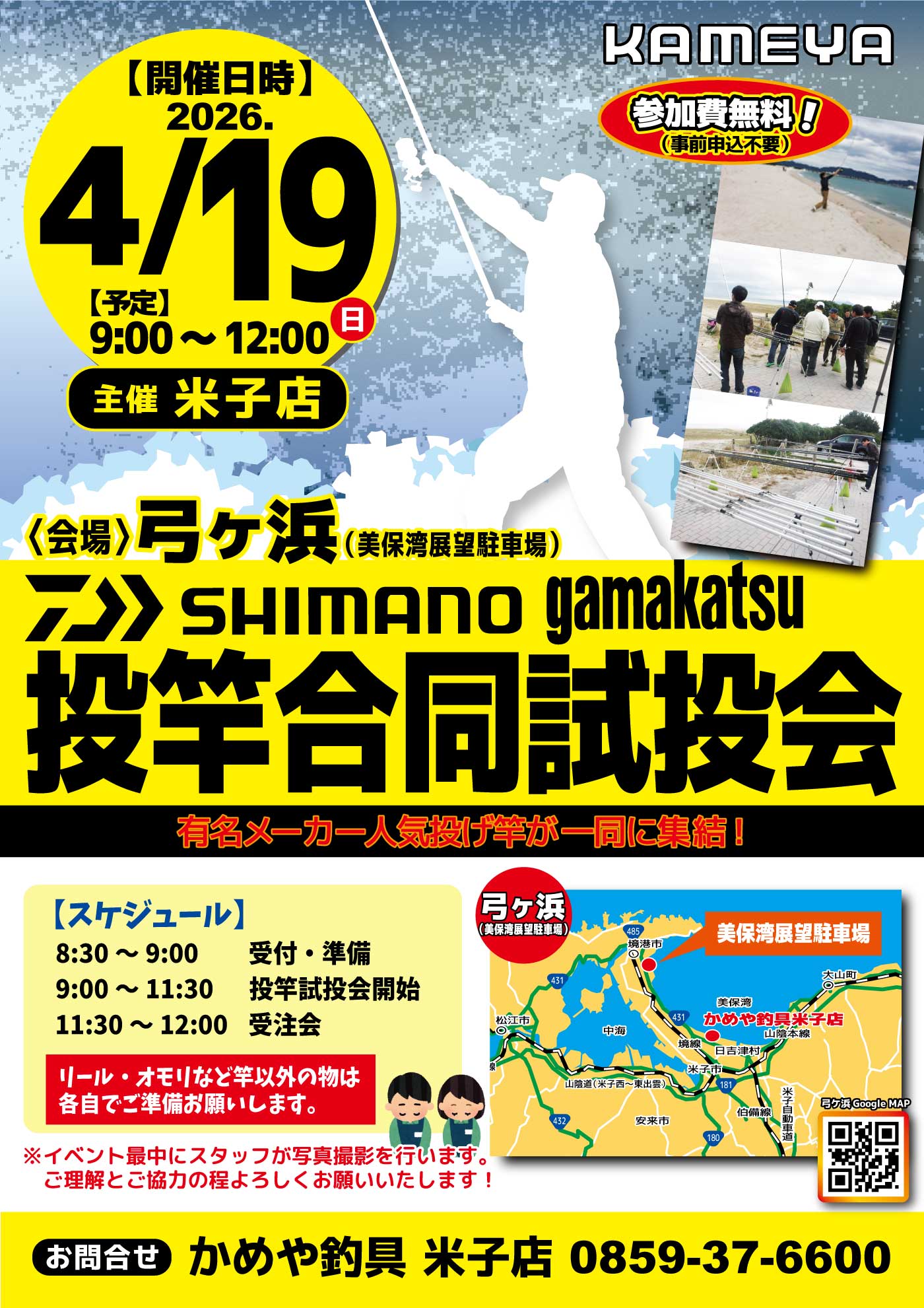 4月192026 【米子店】ダイワ/シマノ/がまかつ 投竿合同試投会 イベント 開催期間 4月19日(日曜日)〜4月19日(日曜日) 開催場所 弓ヶ浜 参加費 無料 問い合わせ 米子店 TEL.0859-37-6600