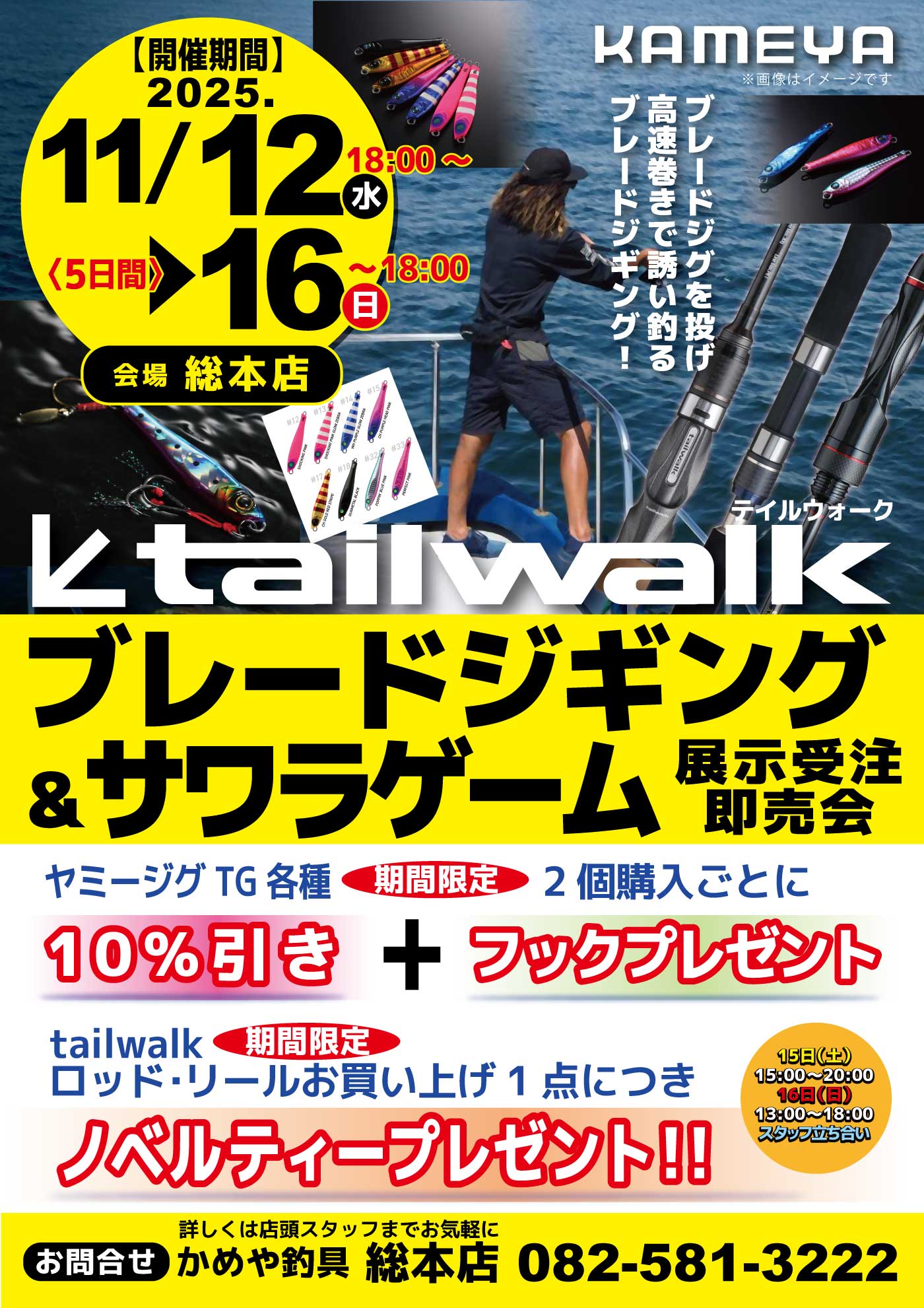 11月122025 【総本店】テイルウォークブレードジギング&サワラゲーム展示受注即売会 イベント 開催期間 11月12日(水曜日)〜11月16日(日曜日) 開催場所 総本店 参加費 問い合わせ 総本店 TEL.082-581-3222
