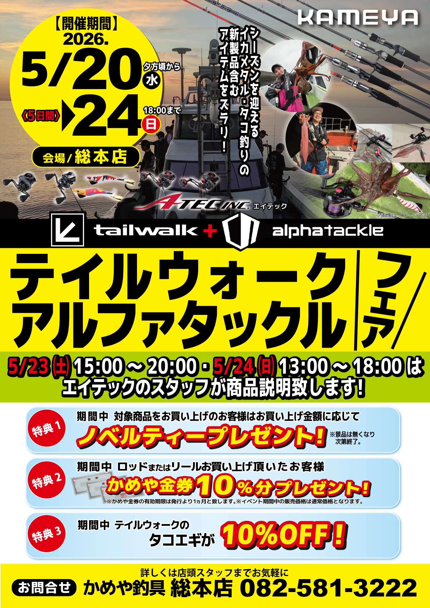5月202026 【総本店】テイルウォーク・アルファタックルフェア イベント 開催期間 5月20日(水曜日)〜5月24日(日曜日) 開催場所 総本店 参加費 問い合わせ 総本店 TEL.082-581-3222
