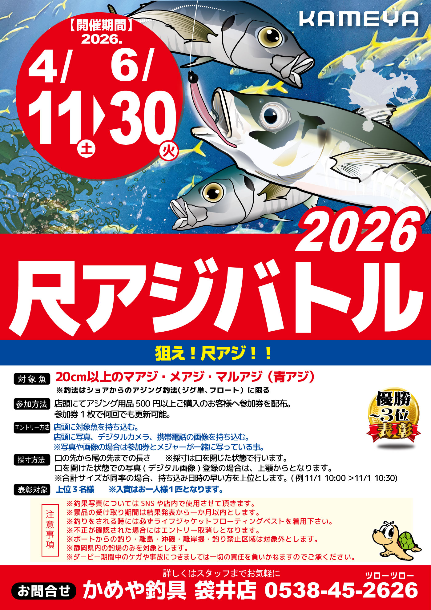 4月302026 【袋井店】尺アジバトル2026 大会・ダービー 開催期間 4月11日(土曜日)〜6月30日(火曜日) 開催場所 袋井店 参加費 アジング用品500円以上ご購入 問い合わせ 袋井店 TEL.0538-45-2626