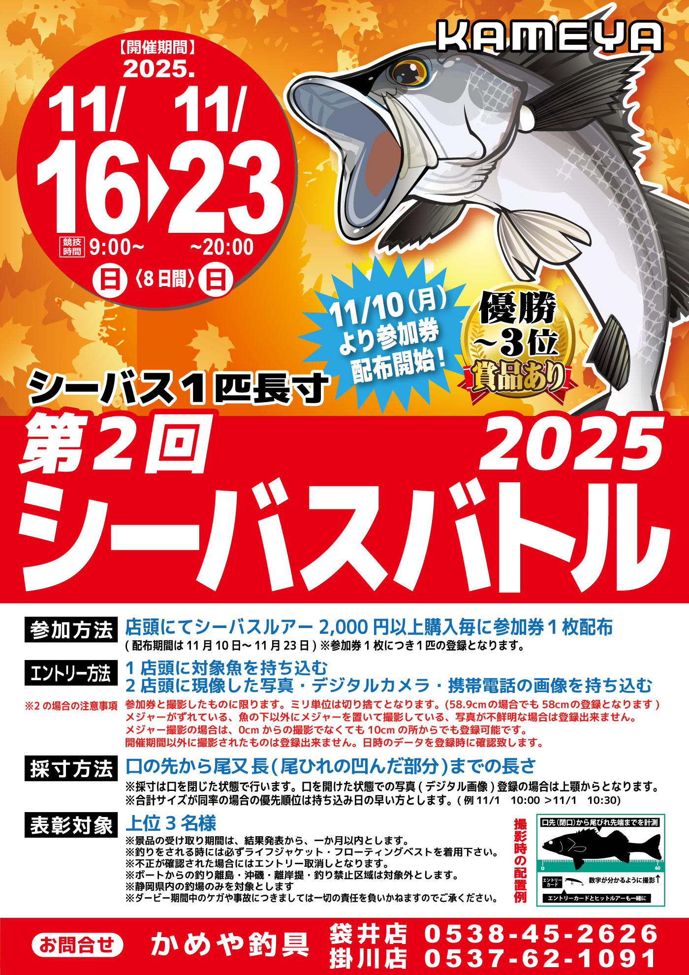 11月232025 【袋井店・掛川店】第2回 シーバスバトル 大会・ダービー 開催期間 11月16日(日曜日)〜11月23日(日曜日) 開催場所 袋井店・掛川店 参加費 問い合わせ 袋井店 TEL.0538-45-2626 、掛川店 TEL.0537-62-1091