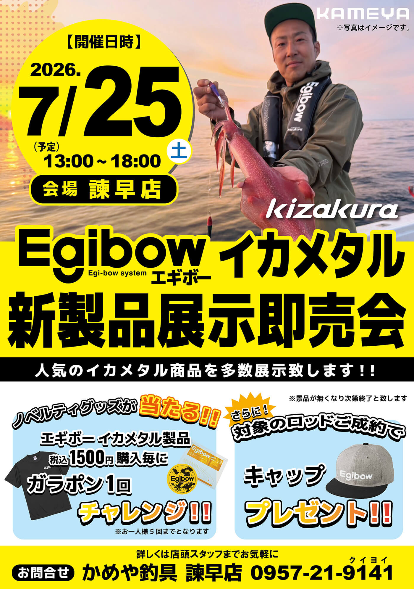 7月252026 【諫早店】エギボー イカメタル新製品展示即売会 イベント 開催期間 7月25日(土曜日)13:00~18:00 開催場所 かめや釣具 諫早店 参加費 ー 問い合わせ 長崎諫早店 TEL.0957-21-9141