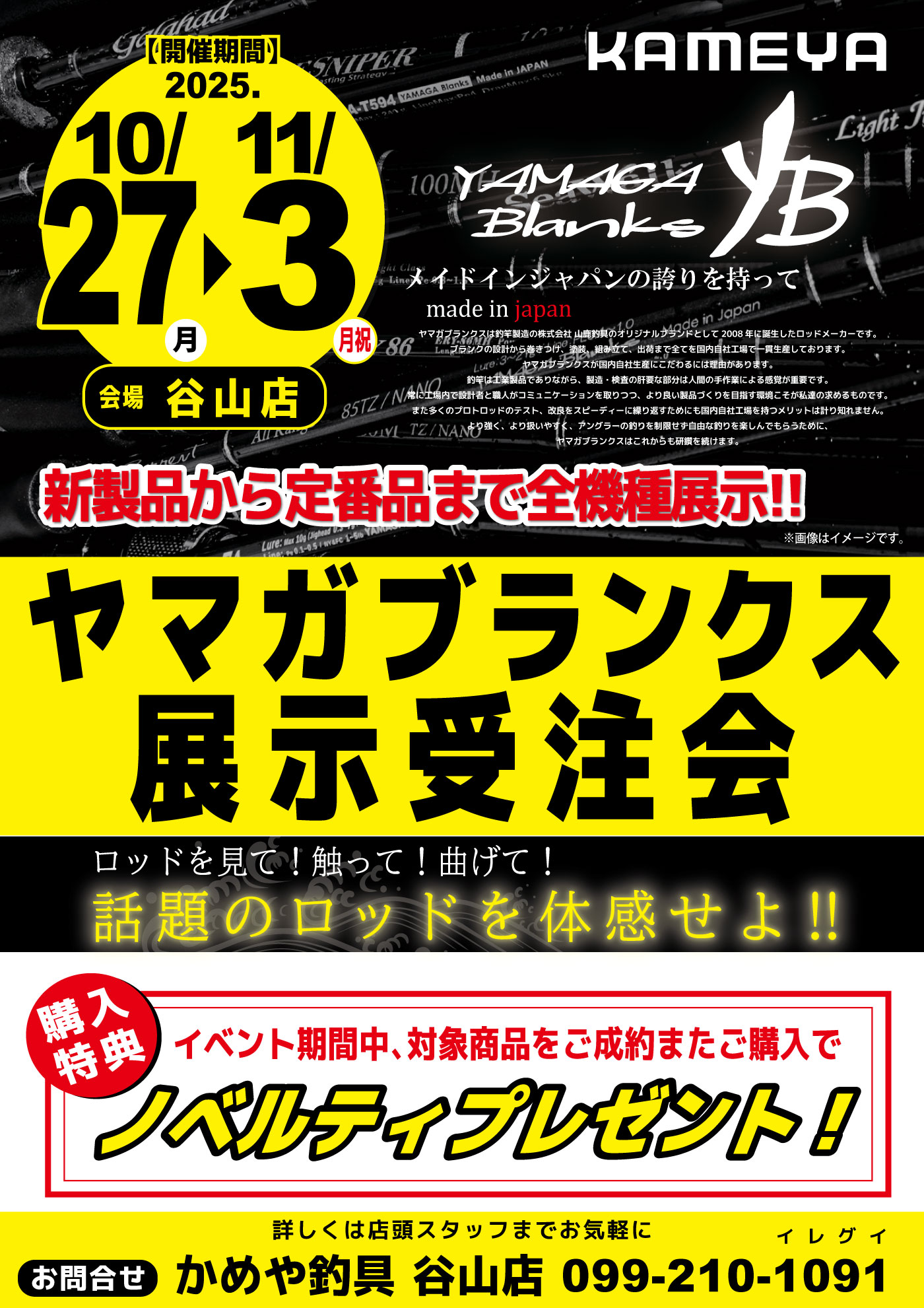 11月032025 【谷山店】ヤマガブランクス展示受注会 イベント 開催期間 10月27日(月曜日)〜11月3日(月曜日) 開催場所 谷山店 参加費 - 問い合わせ 鹿児島谷山店 TEL.099-210-1091