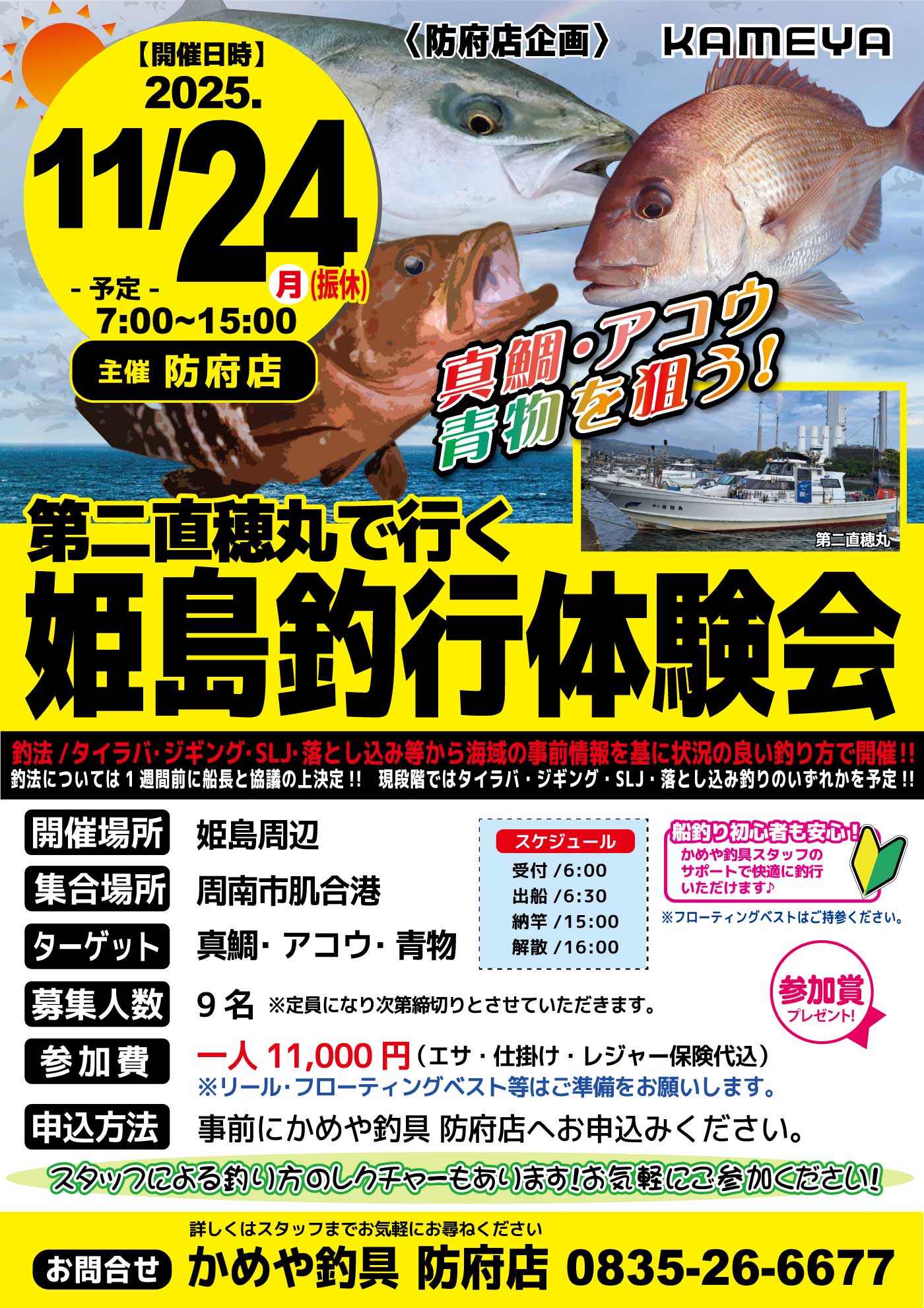 11月242025 【防府店】第二直穂丸で行く姫島釣行体験会 イベント 開催期間 11月24日(月曜日)〜11月24日(月曜日) 開催場所 姫島周辺 参加費 1人11,000円 問い合わせ 防府店 TEL.0835-26-6677