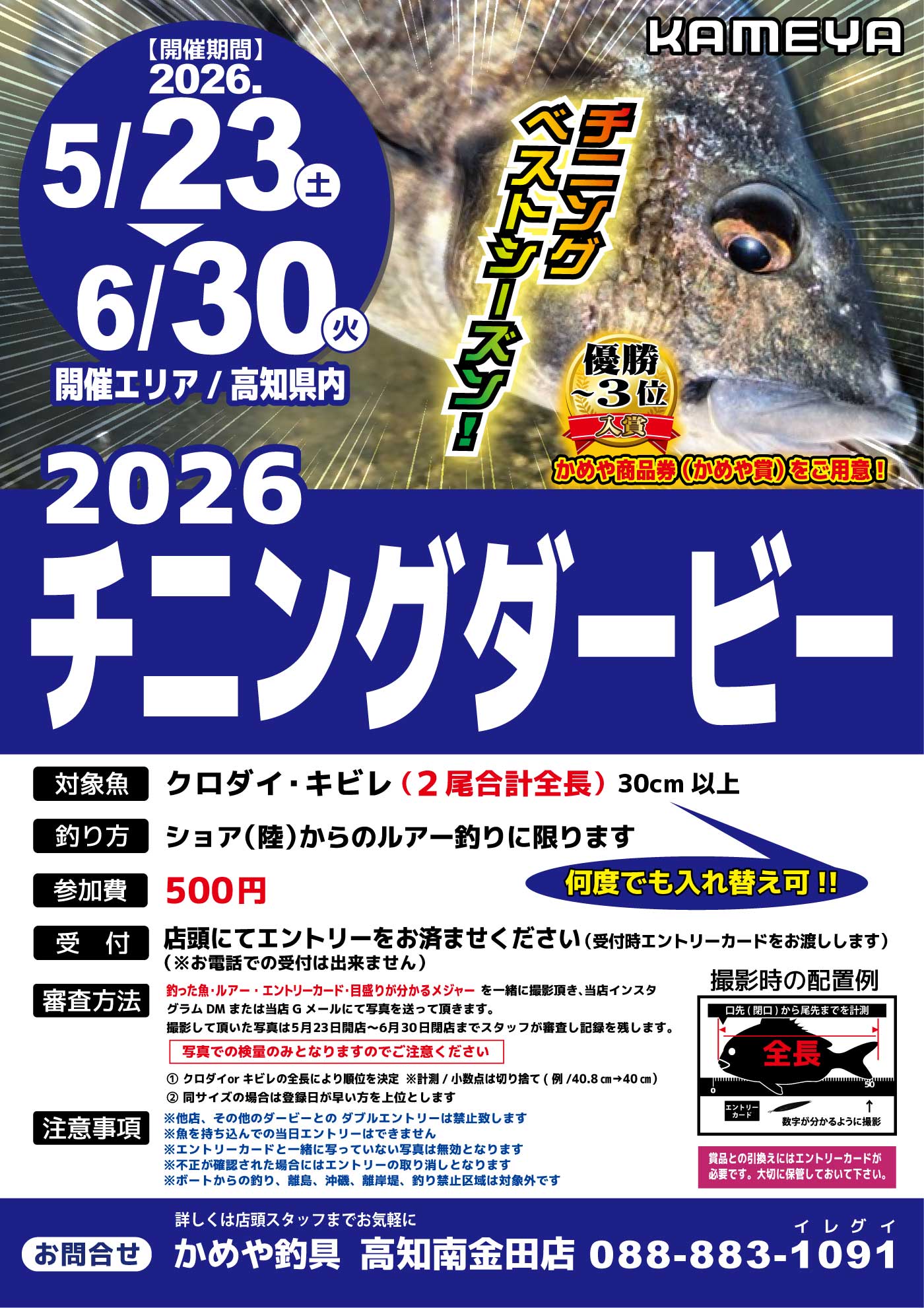 6月302026 【高知南金田店】2026チニングダービー 南金田店大会・ダービー 開催期間 5月23日(土曜日)〜6月30日(火曜日) 開催場所 高知県内 参加費 500円 問い合わせ 南金田店 TEL.088-883-1091