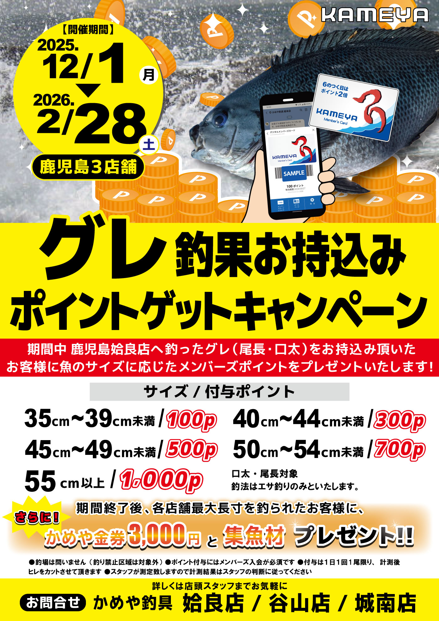 2月282026 【鹿児島エリア3店舗】グレ釣果持込みポイントゲットキャンペーン イベント 開催期間 12月1日(月曜日)〜2月28日(土曜日) 開催場所 かめや釣具 城南店/姶良店/谷山店 参加費 問い合わせ 鹿児島城南店 TEL.099-239-1191 、鹿児島姶良店 TEL.0995-67-1091 、鹿児島谷山店 TEL.099-210-1091