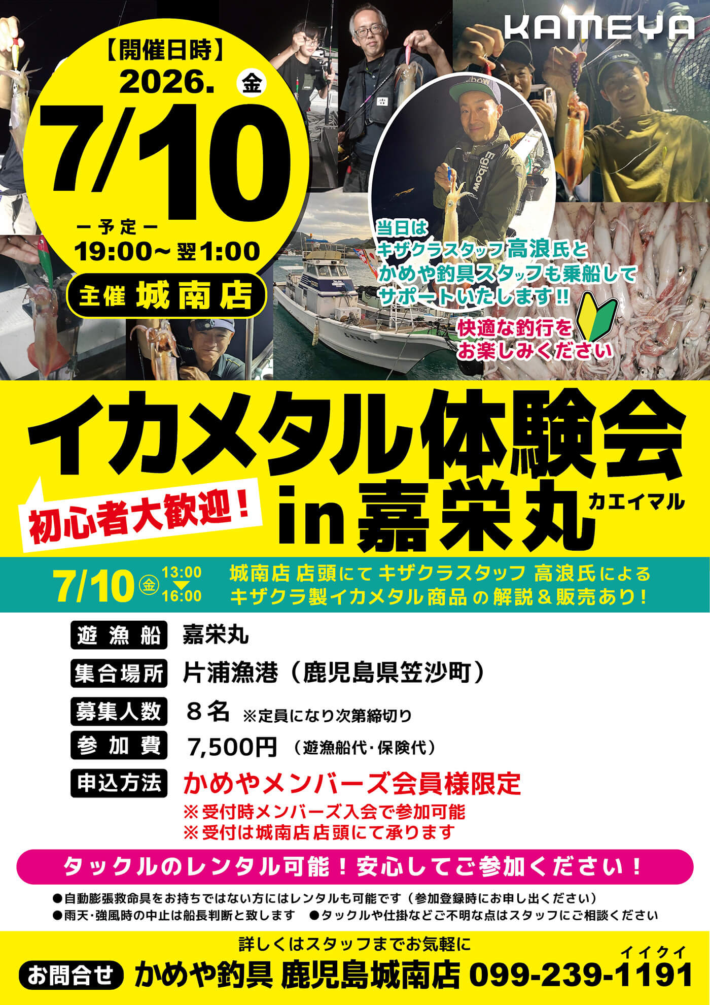 7月102026 【鹿児島城南店】イカメタル体験会in嘉栄丸 イベント 開催期間 7月10日(金曜日)19:00~1:00 開催場所 片浦漁港出船 参加費 7,500円 問い合わせ 鹿児島城南店 TEL.099-239-1191